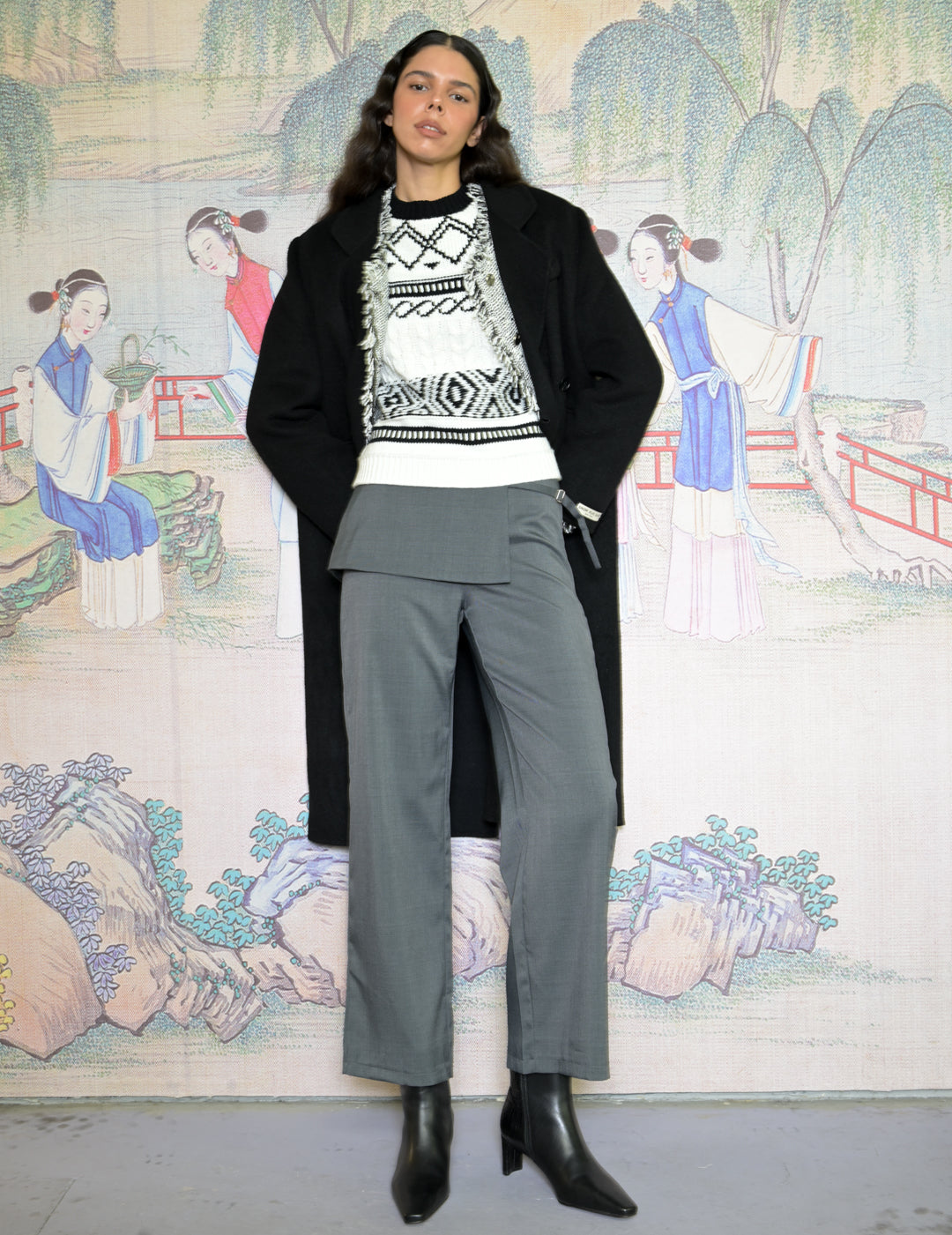 Gao is a talented tailor with a distinct signature of puzzling asymmetric “dual” or half-and-half looks together.