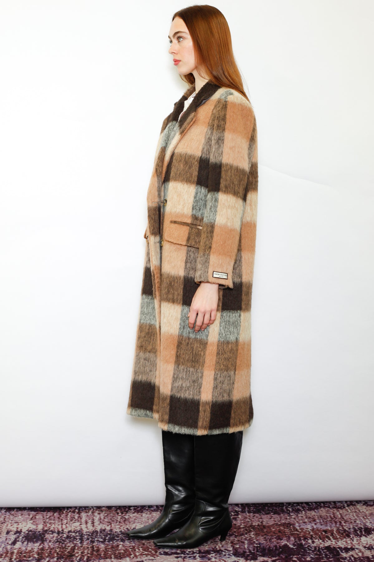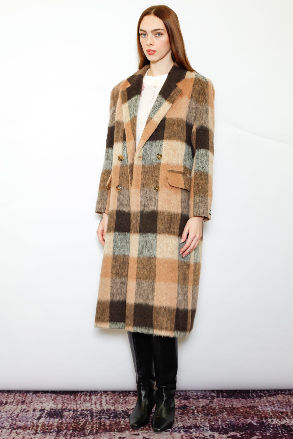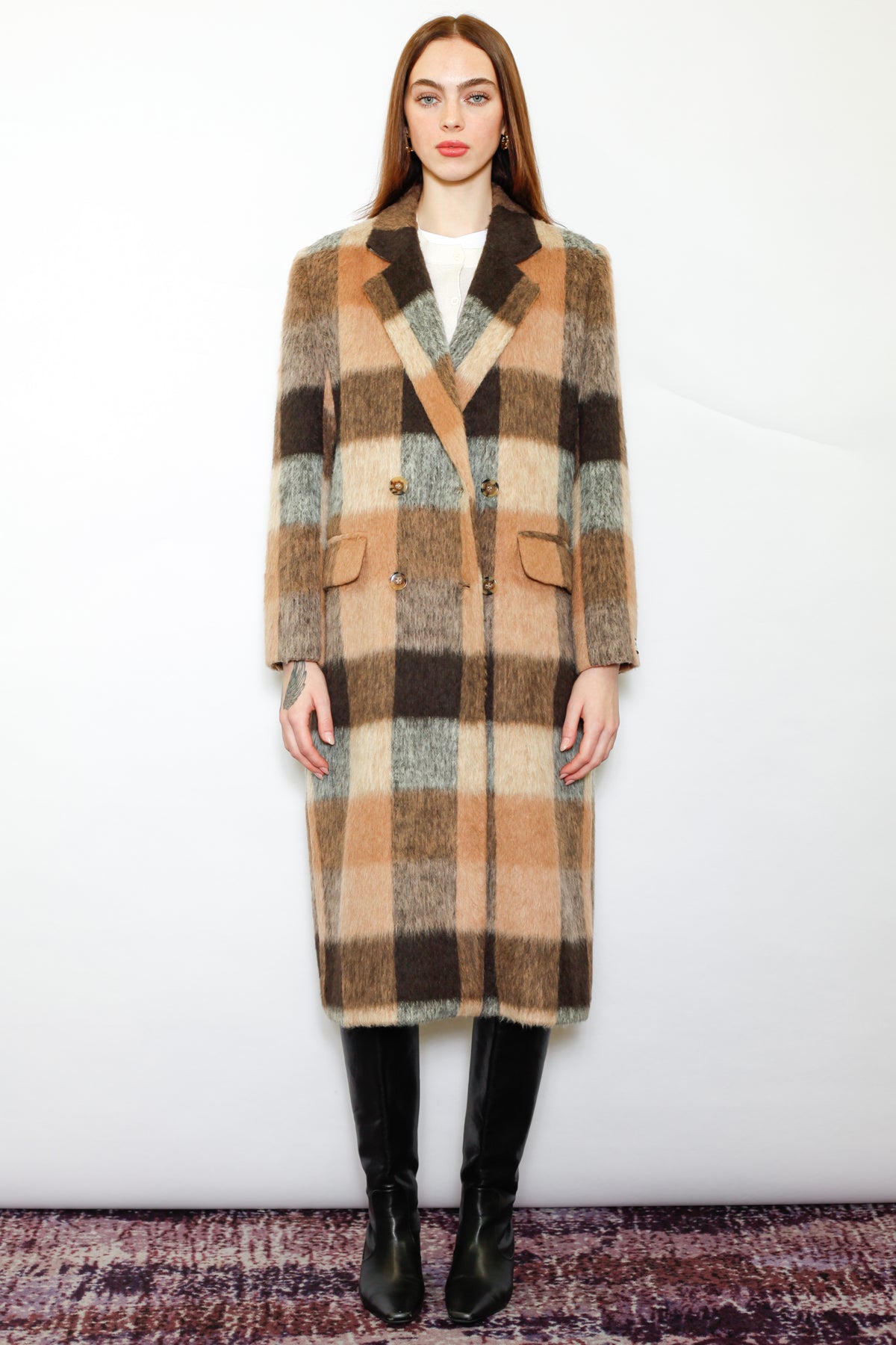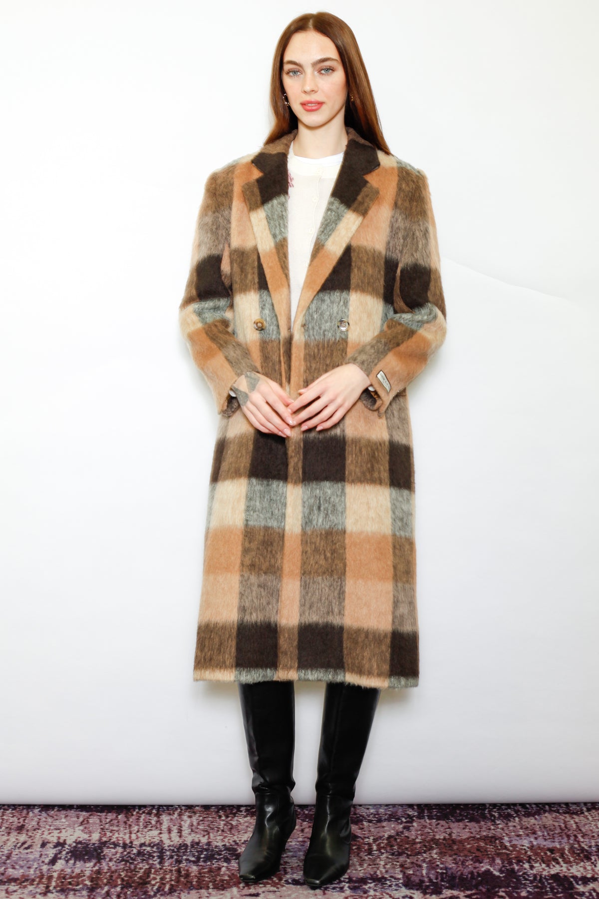 Engorge yourself with dazzling splendor in our Wool Camel Brown Plaid Coat. Adorned with a subtle and refined beige plaid, the rich camel hue adds warmth to this piece. The delicate brown plaid enhances its charm, while the double-breasted closure and classic lapel showcase impeccable detailing. A delicate combination of style and versatility, this coat features a full lining and two side flap pockets. It perfectly blends classic design with contemporary allure, making a statement in both fashion and functionality.