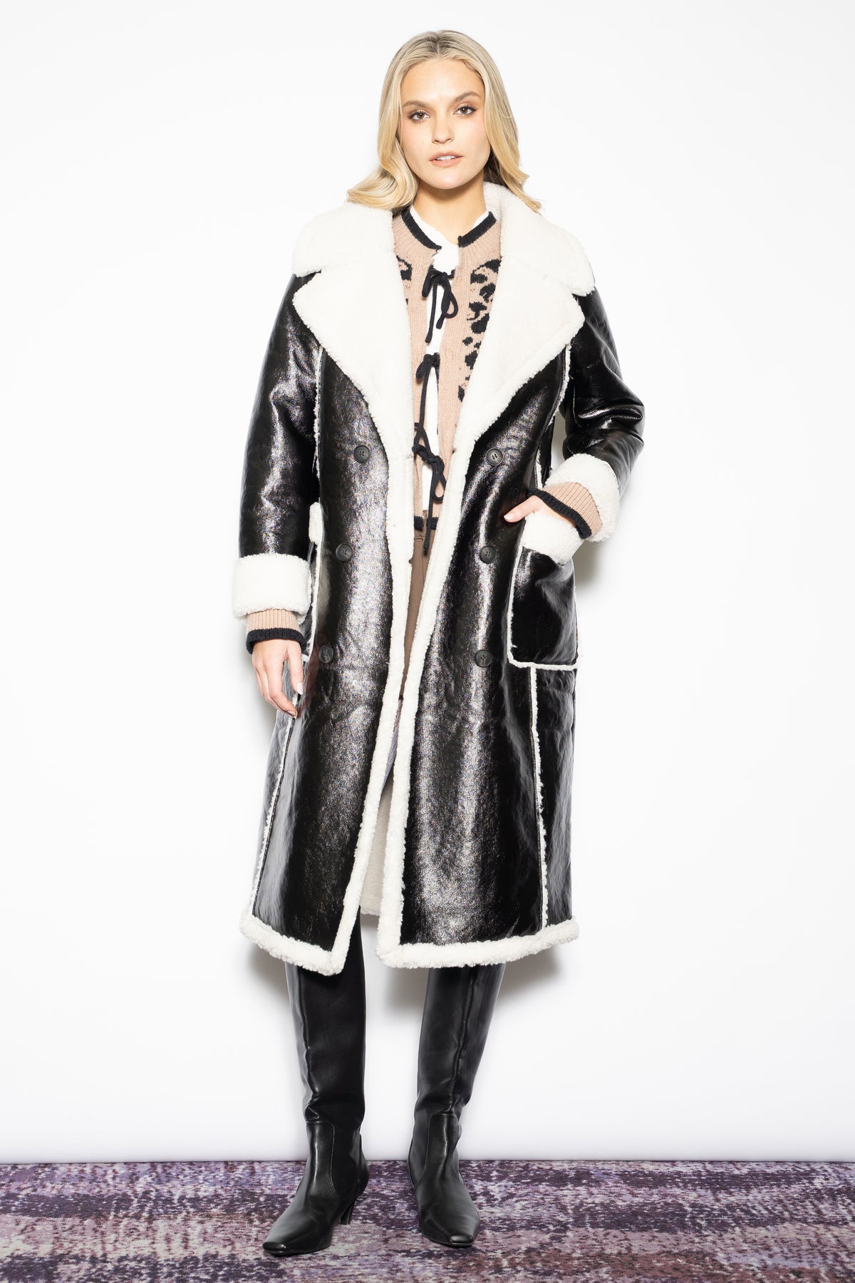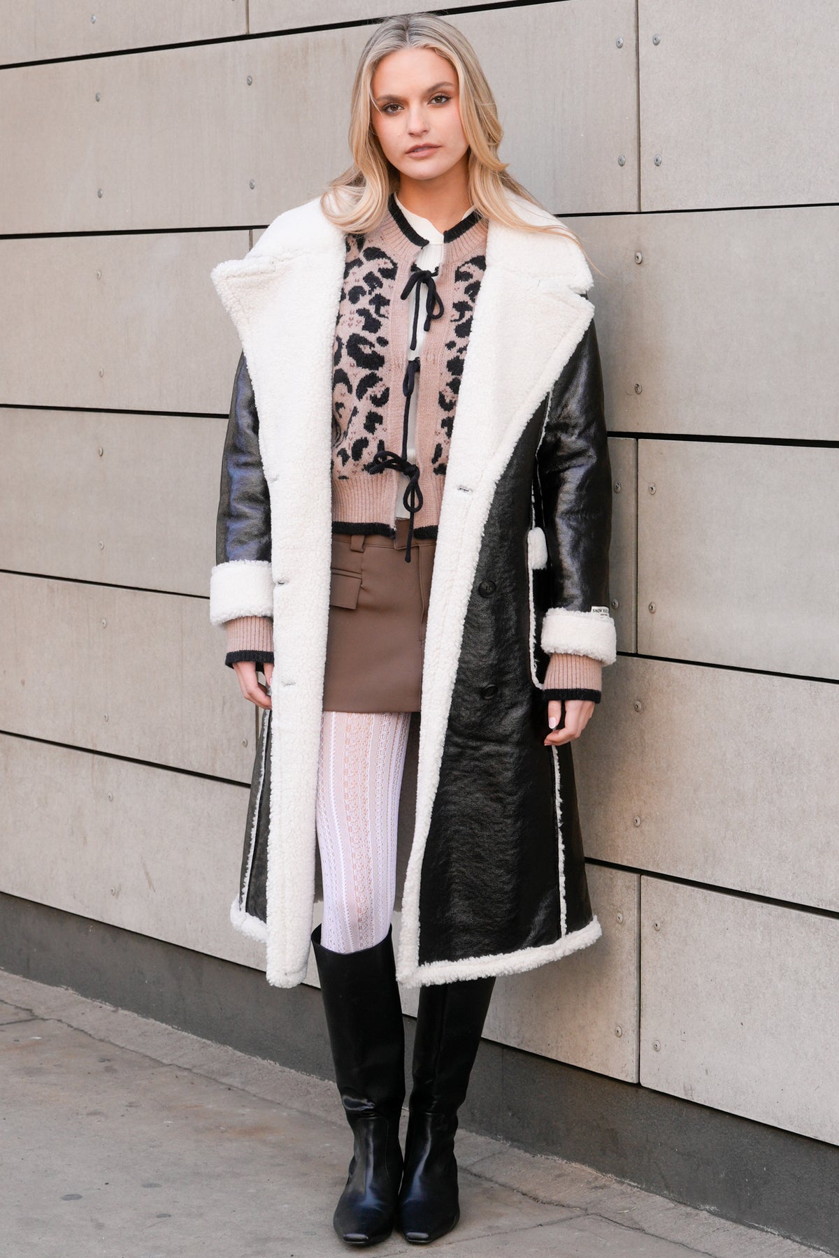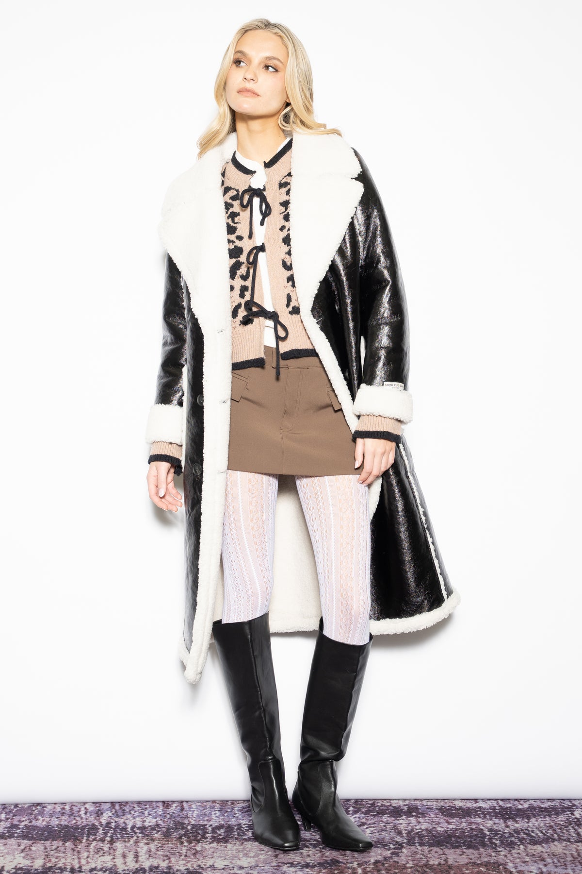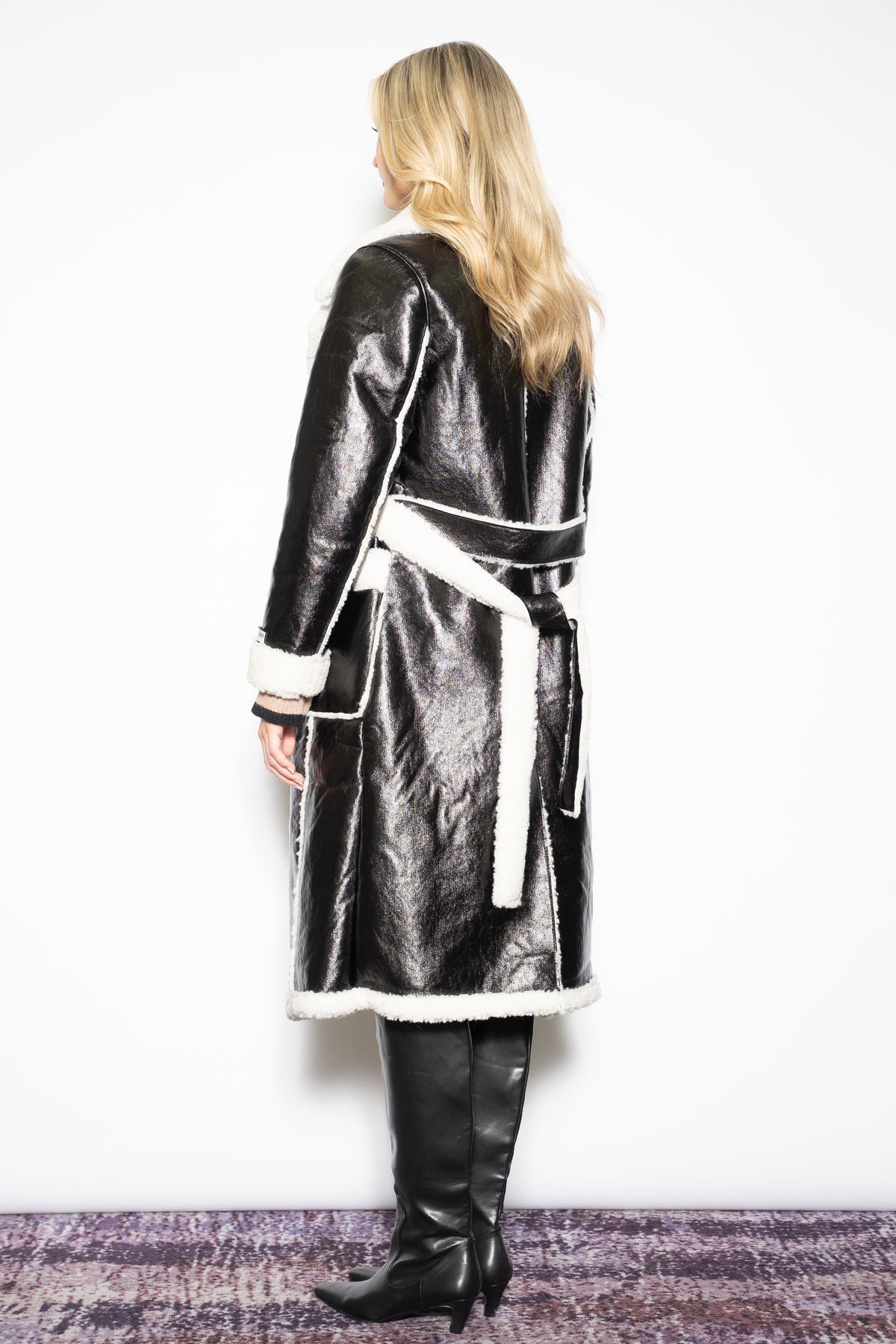 A fresh take on a classic, this black wool-blend faux shearling coat by Snow Xue Gao balances structure with softness. The contrast of the sleek black exterior and plush cream faux fur lining adds quiet drama and warmth. A soft waist tie cinches the shape just right, giving you the option to wear it loose or wrapped up. Timeless, cozy, and just a little unexpected—just how winter should feel.