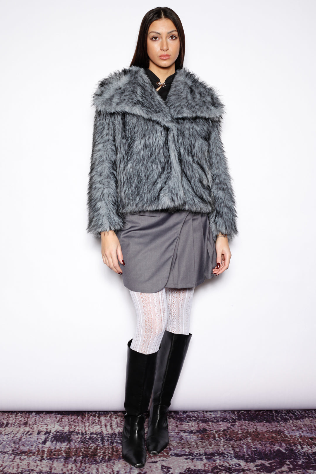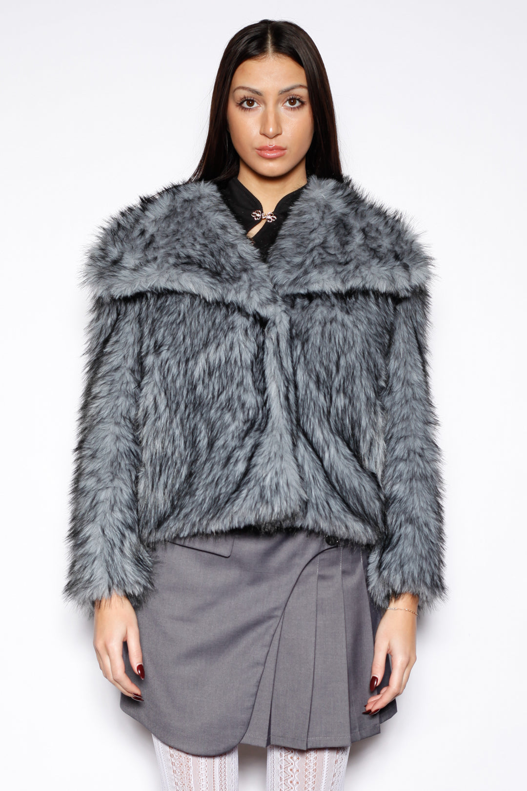 A statement wool-blend faux fur jacket featuring luxuriously long fur and an oversized collar. Designed in a cool grey-blue tone, the jacket is subtly framed with black edging that adds depth and contrast. It offers both warmth and elevated style, making it a standout piece for cold-weather looks.