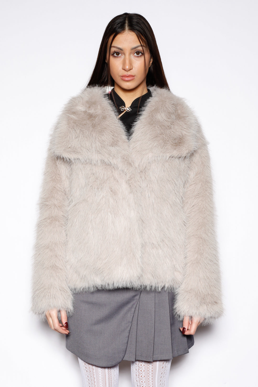 A sophisticated wool-blend faux fur jacket designed with long, silky fibers that add movement and texture. The oversized collar softly frames the shoulders and neckline, giving the piece a luxurious, enveloping feel. Finished in a light gray hue, this jacket delivers a timeless, polished look while providing exceptional warmth and comfort.