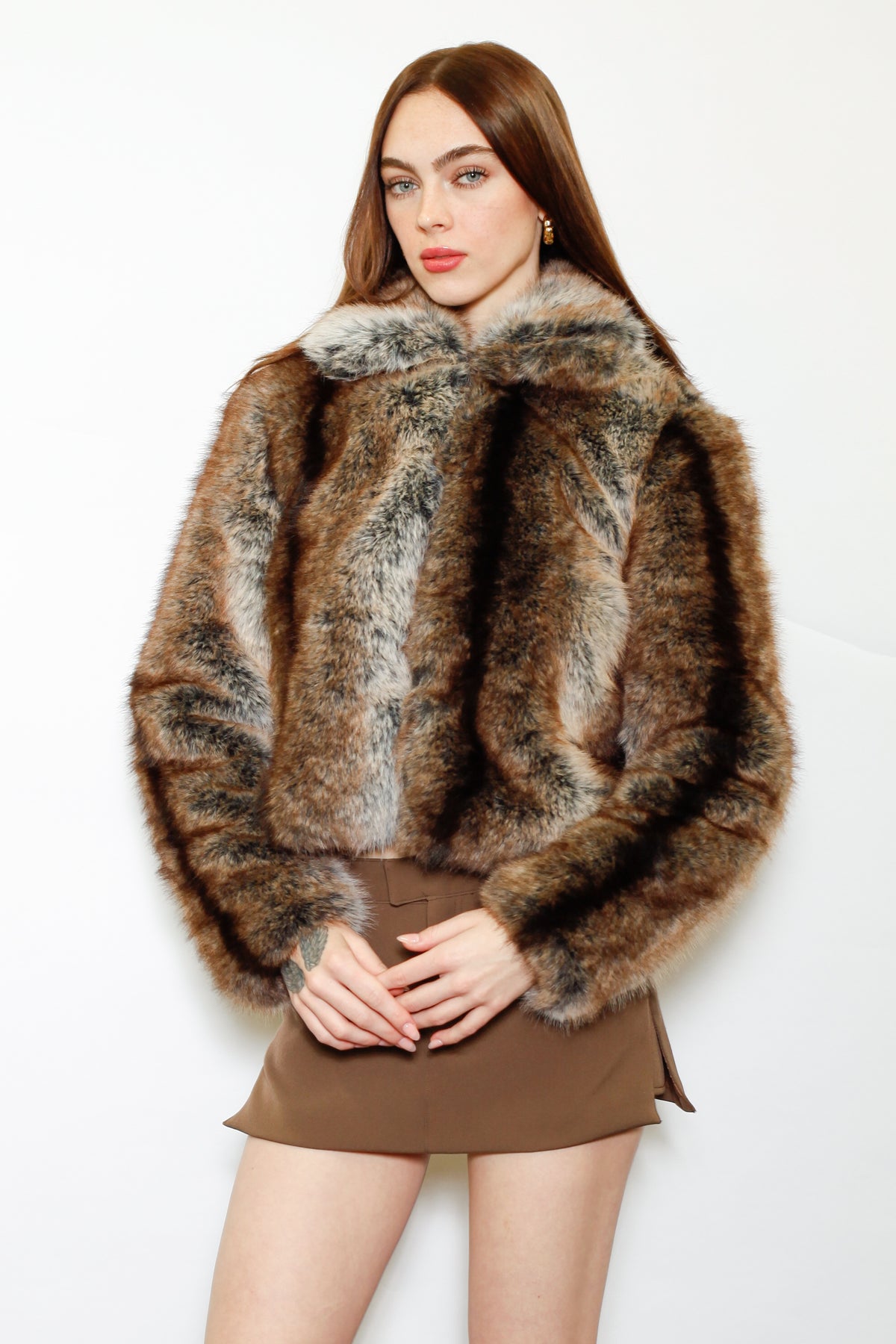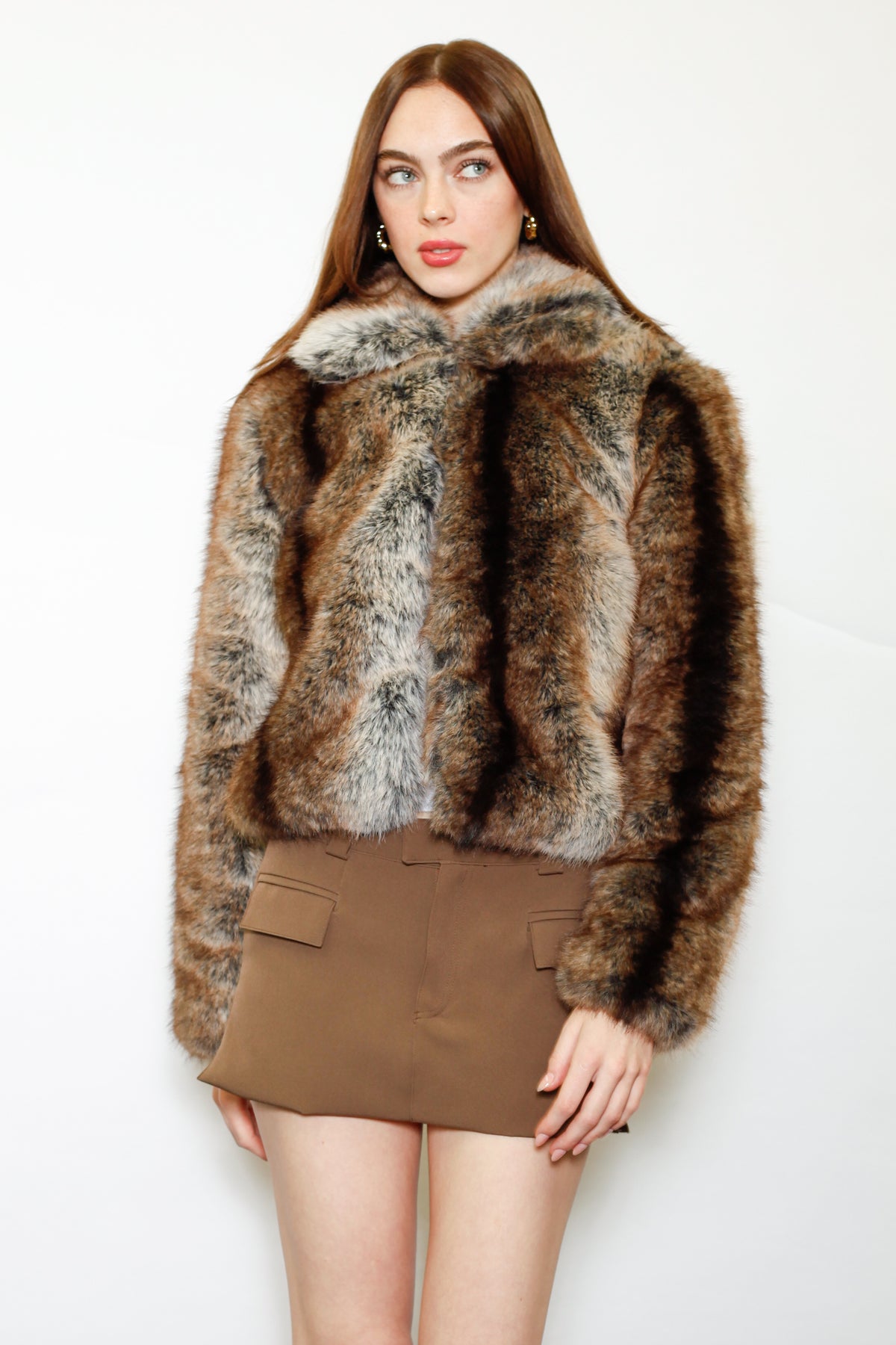 A luxe outerwear piece with timeless attitude. Crafted in a rich wool-blend faux fur, this jacket offers both bold texture and warmth in a silhouette that feels elevated yet wearable. The natural dark brown tones with soft grey variation evoke a vintage-inspired sophistication, perfect for layering over winter tailoring or styled down with everyday essentials.