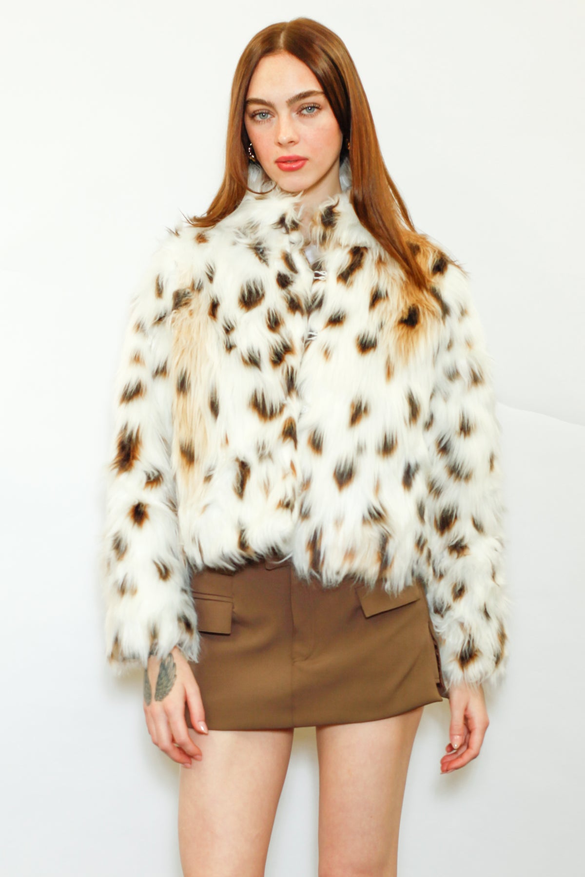 Statement-making outerwear with a wild side.This faux fur jacket brings playful glamour to your cold-weather wardrobe with a bold spotted pattern inspired by nature’s most striking coats. Designed to elevate your city style, the silhouette is softly structured for a polished yet effortless look.