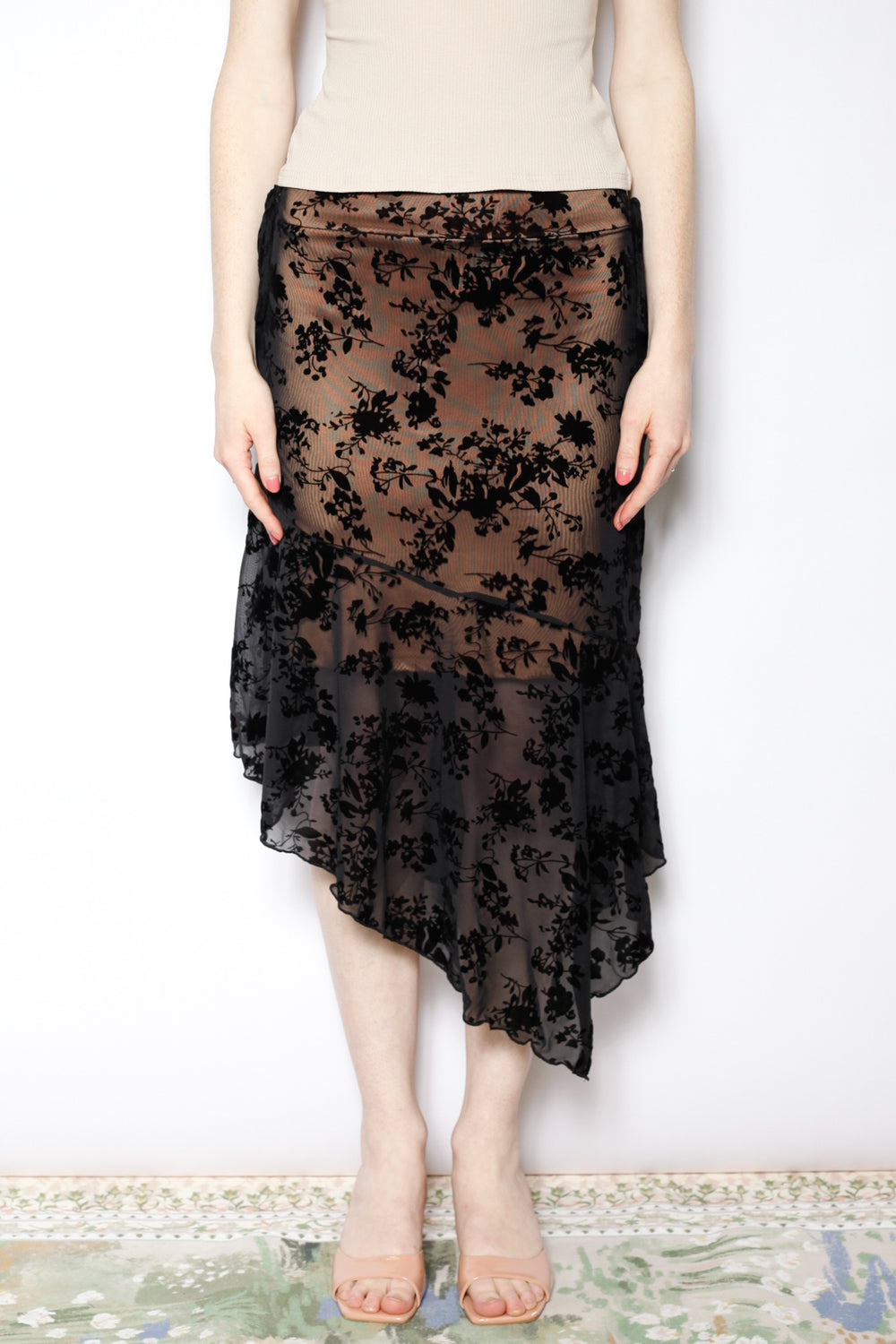 Cotton Mesh Black Floral Asymmetrical Skirt