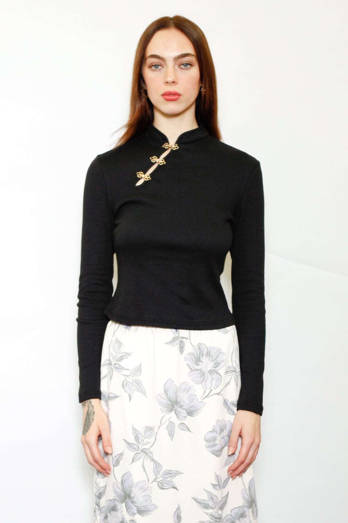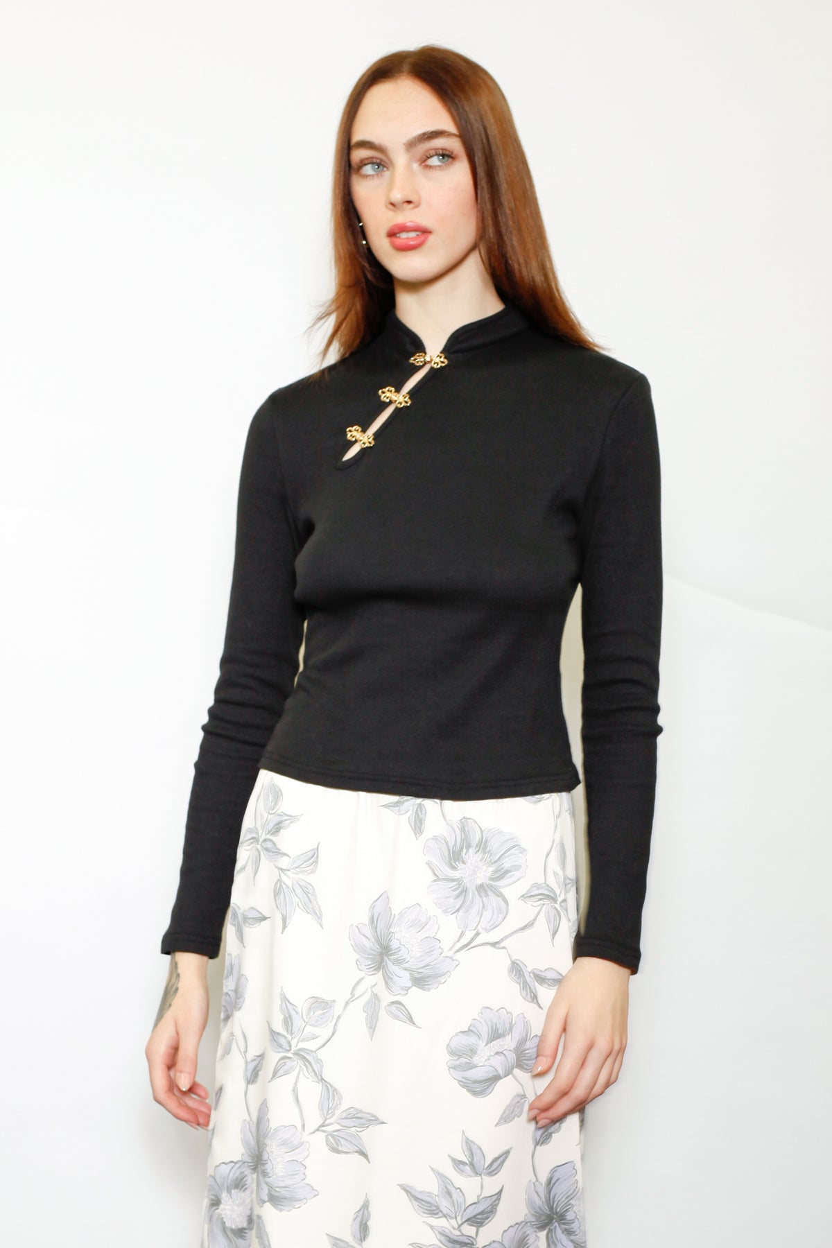 Modern minimalism with a nod to tradition.This sleek black sweater reimagines the classic Qipao silhouette in a ribbed cotton knit. Designed with a sculpted high collar and gold-tone frog knot closures along the neckline, it brings refined edge and comfort to everyday dressing. Pair it with tailored pants or silk skirts for a bold, balanced look.