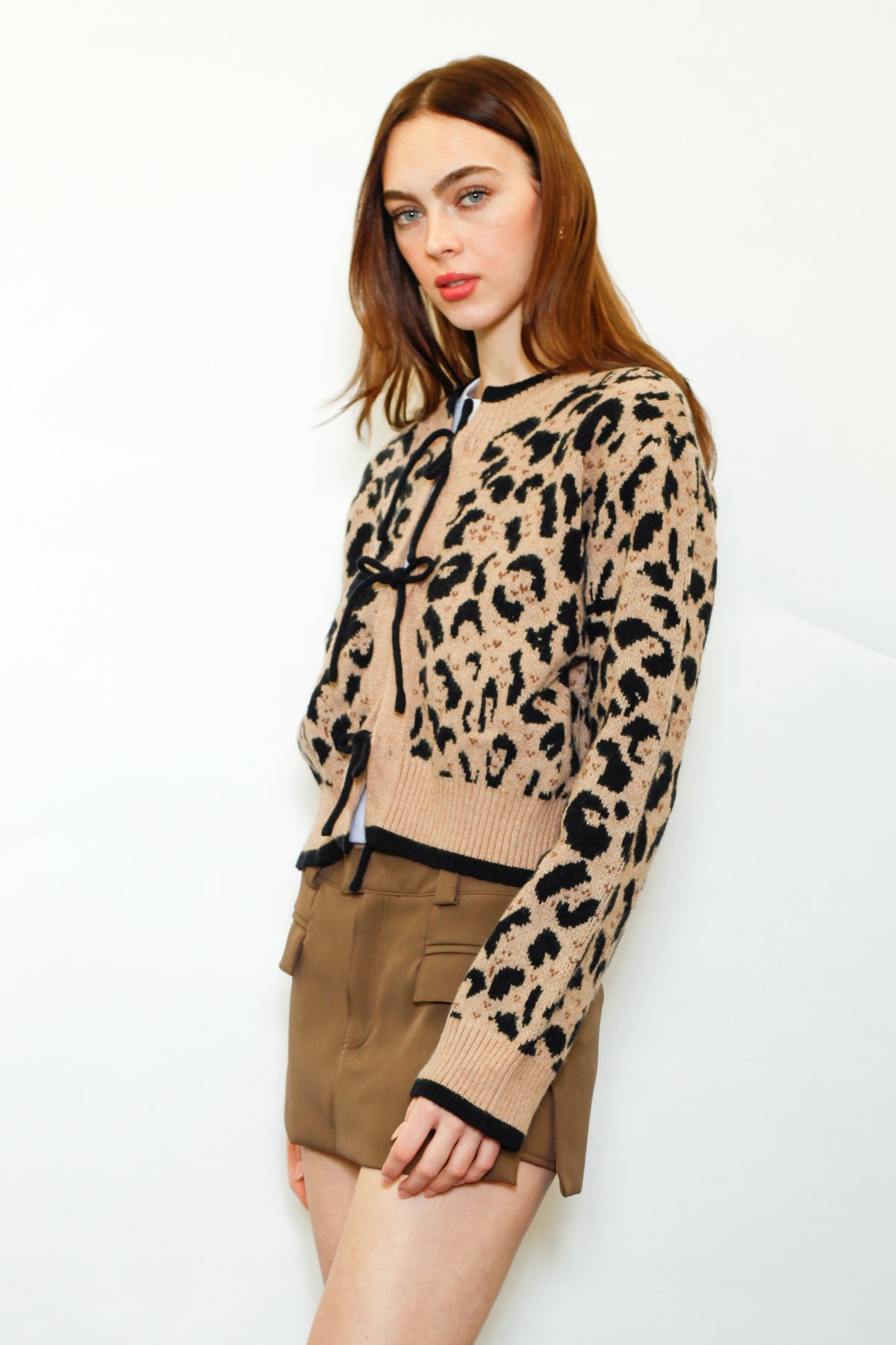 A playful twist on a classic silhouette.This cropped wool cardigan is knit in a bold jacquard animal pattern and detailed with contrast black bow-tie closures down the front for a feminine and distinctive look. The relaxed fit and ribbed trims make it an effortlessly stylish layer for cooler seasons.