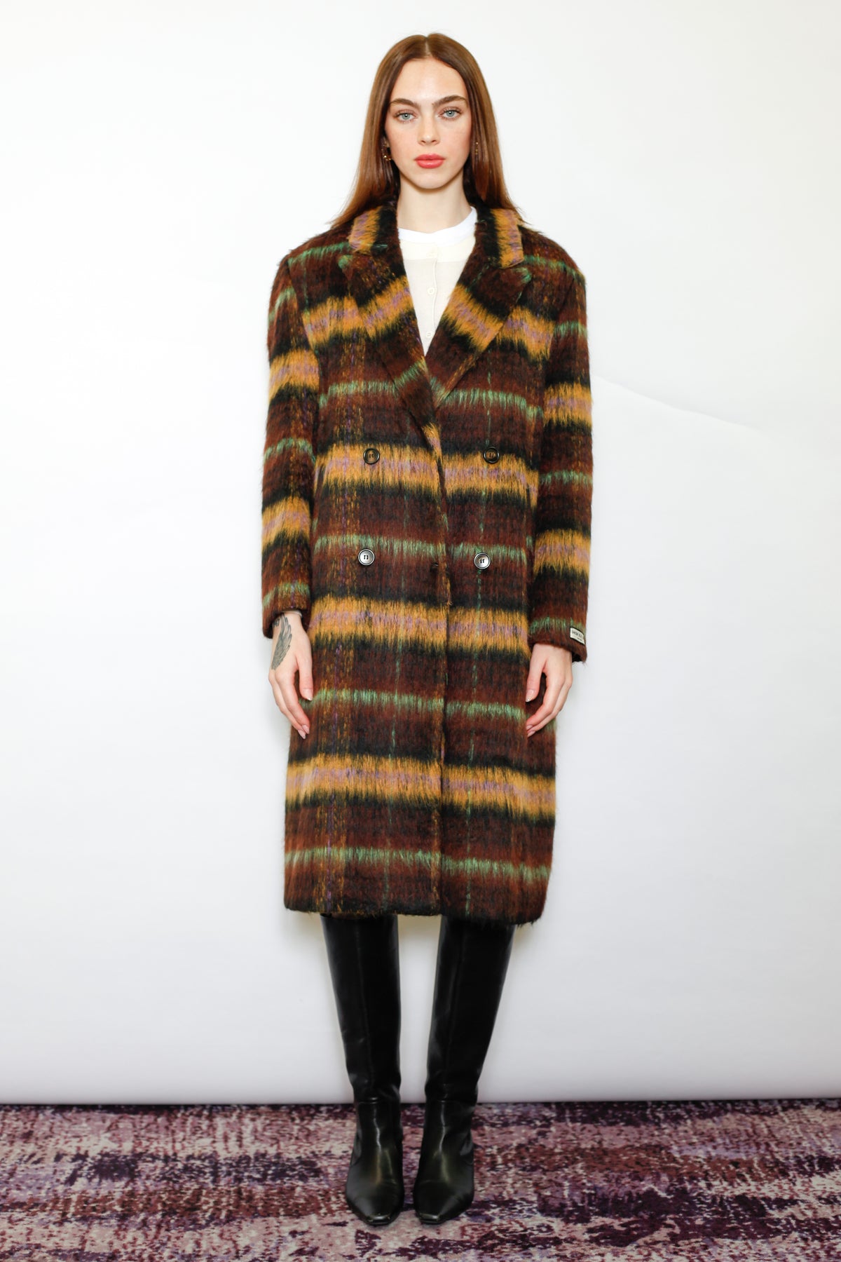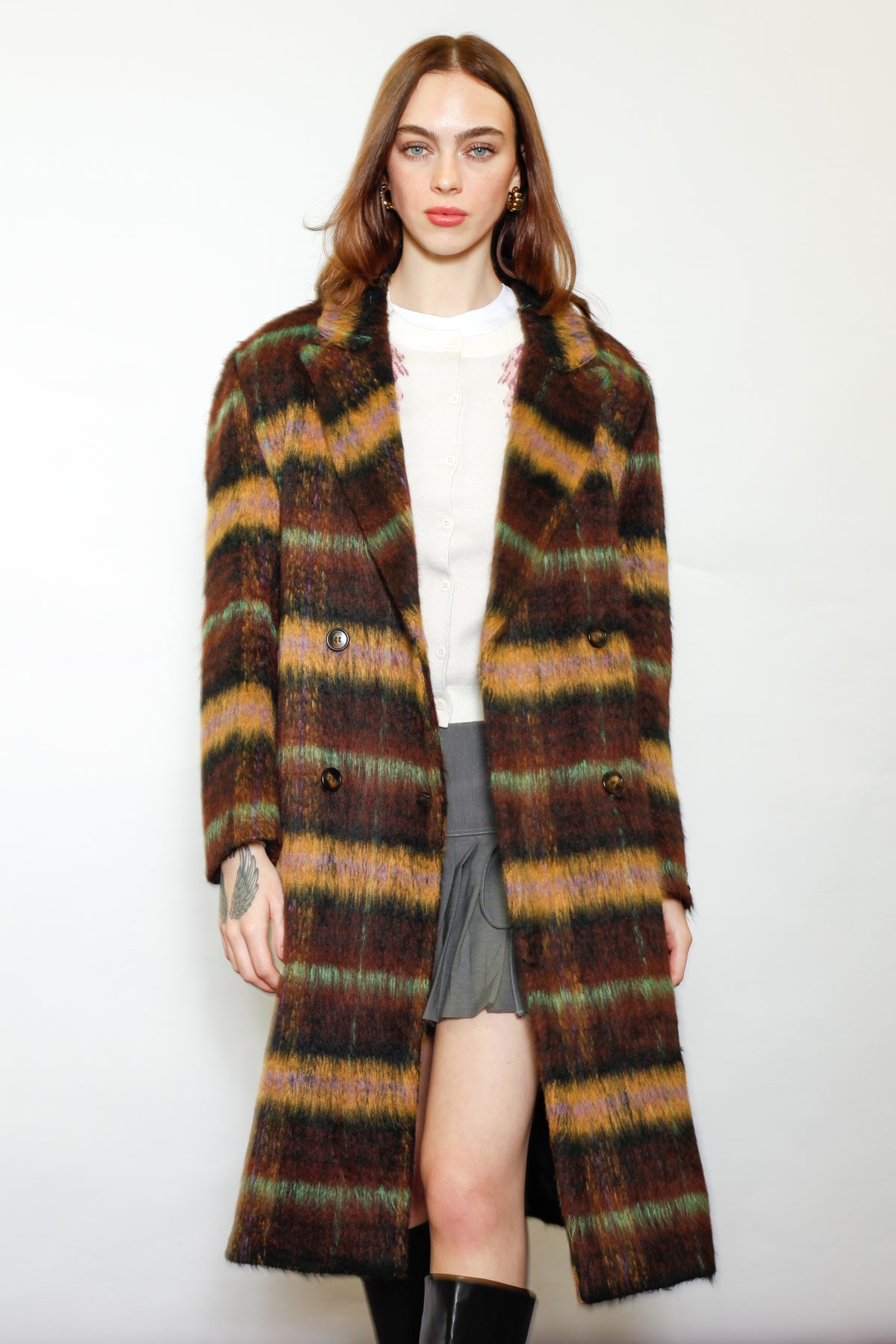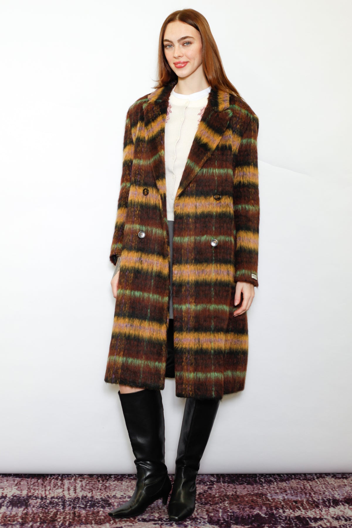 Introducing the Heavy Wool Brown Plaid Coat, a double-breasted design featuring four buttons and a peaked lapel. The color palette of this plaid is a captivating blend of rich brown, deep yellow, and a refreshing touch of mint green. Together, these harmonious hues create a sophisticated and visually pleasing combination, adding an exquisite charm to the overall design. The intricate interplay of these colors in the plaid pattern forms a delightful composition, making a bold yet tasteful statement in any ensemble.