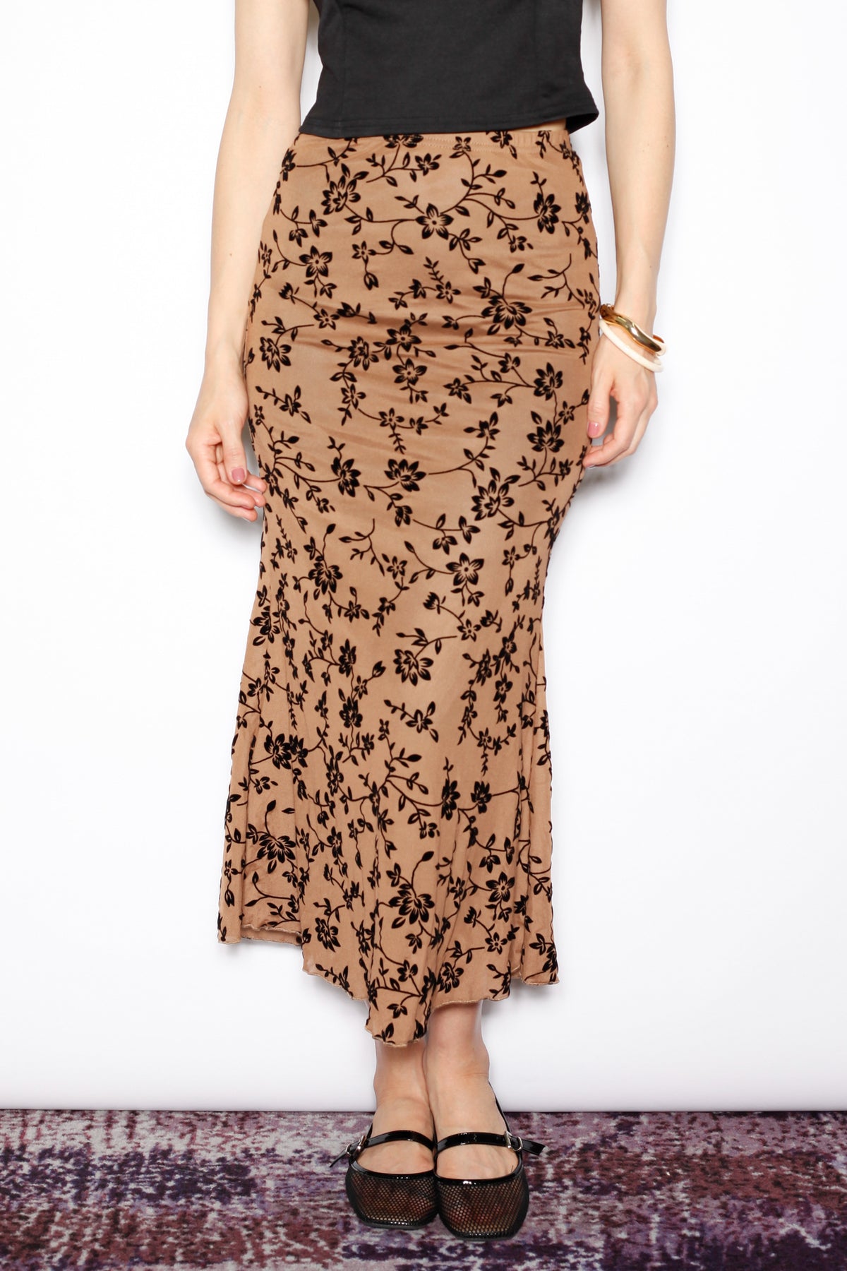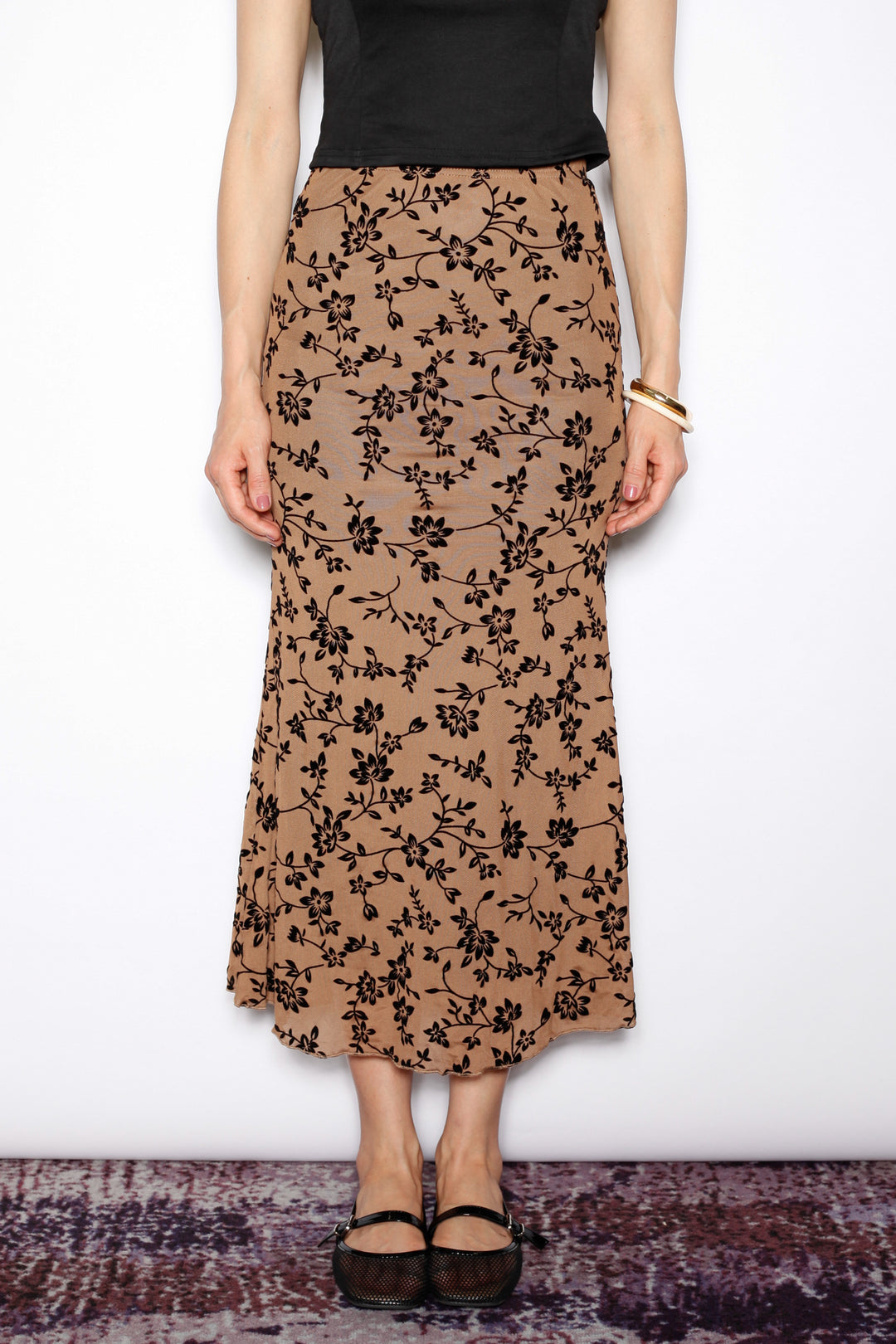 A chic and stretchy essential, this brown midi skirt features an allover black floral velvet pattern on soft jersey mesh. Designed to hug the body and flare slightly at the hem, it's perfect for day-to-night styling with just the right touch of texture.