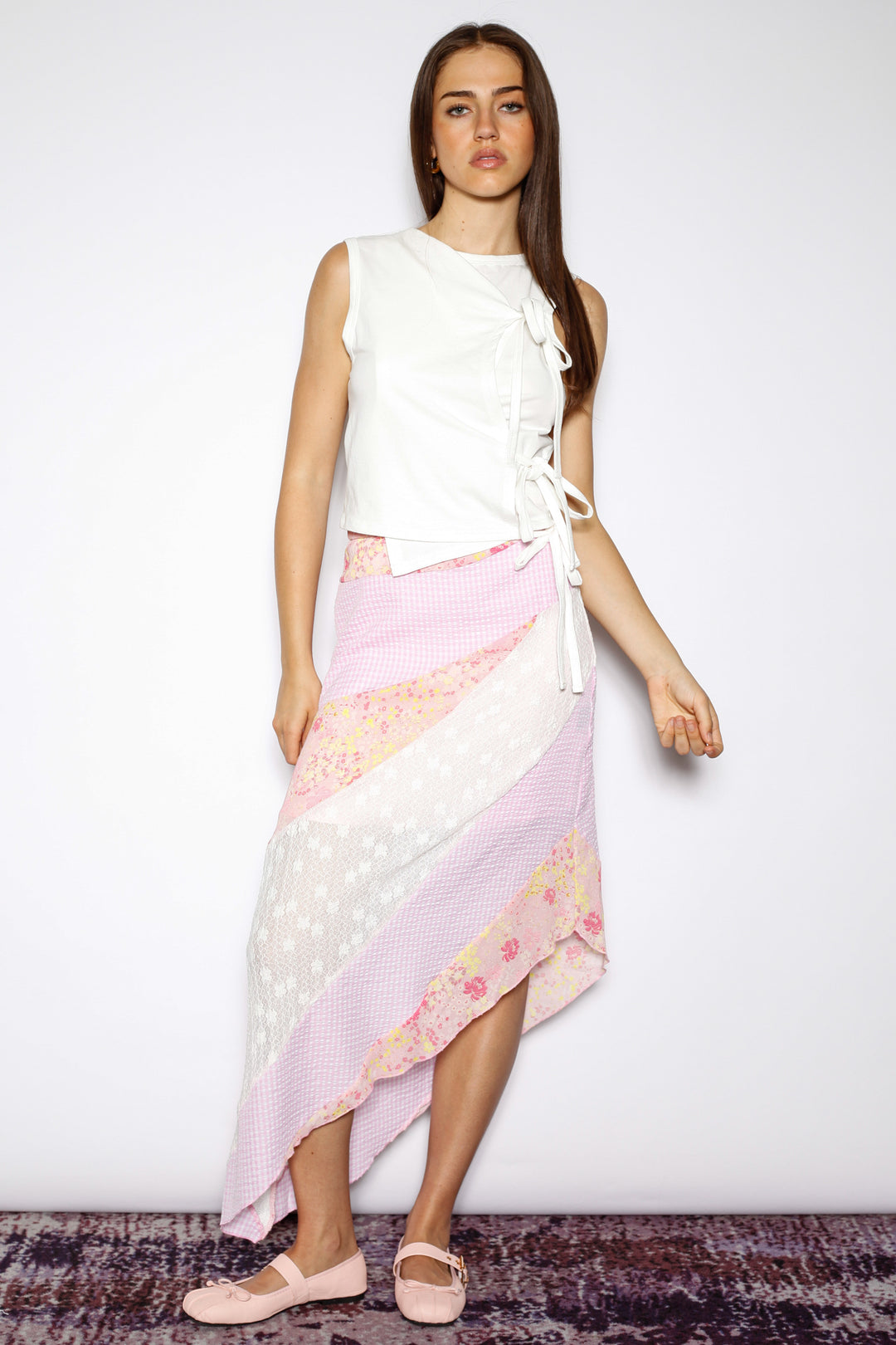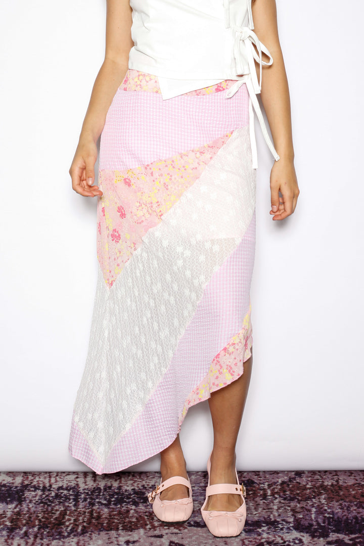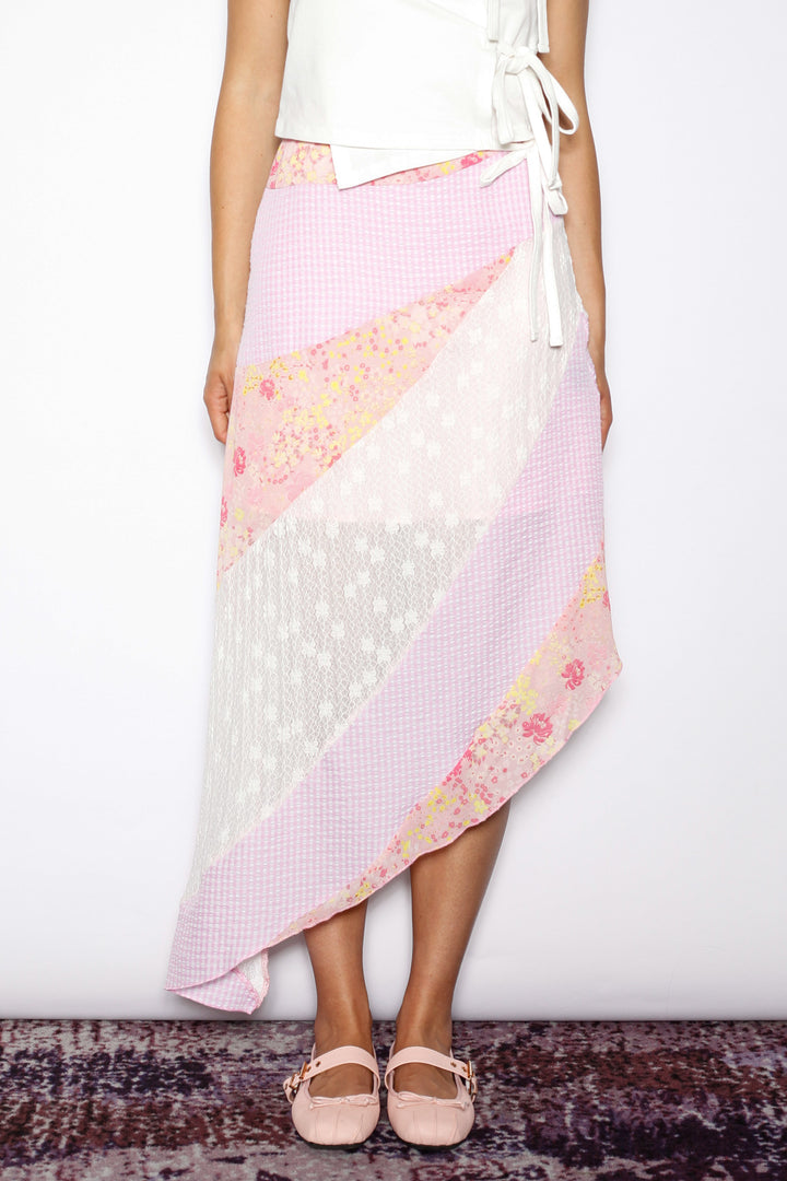 A delicate fusion of vintage inspiration and modern femininity, this asymmetrical skirt is constructed from a patchwork of silk prints and textures, including florals, gingham, and lace. The soft bias drape hugs the body and flares out with movement, while the hand-cut panels create a collage-like visual flow. Finished with a wrap effect and high-low hemline, this piece brings effortless elegance with a touch of charm.
