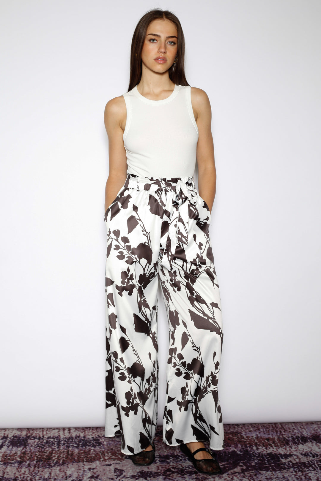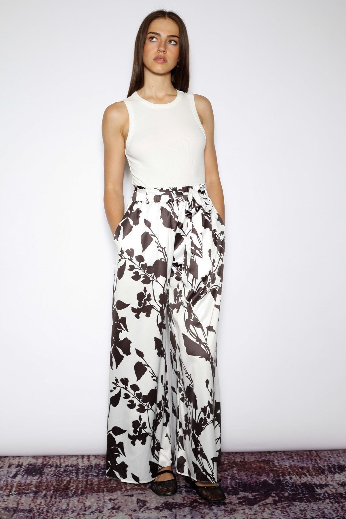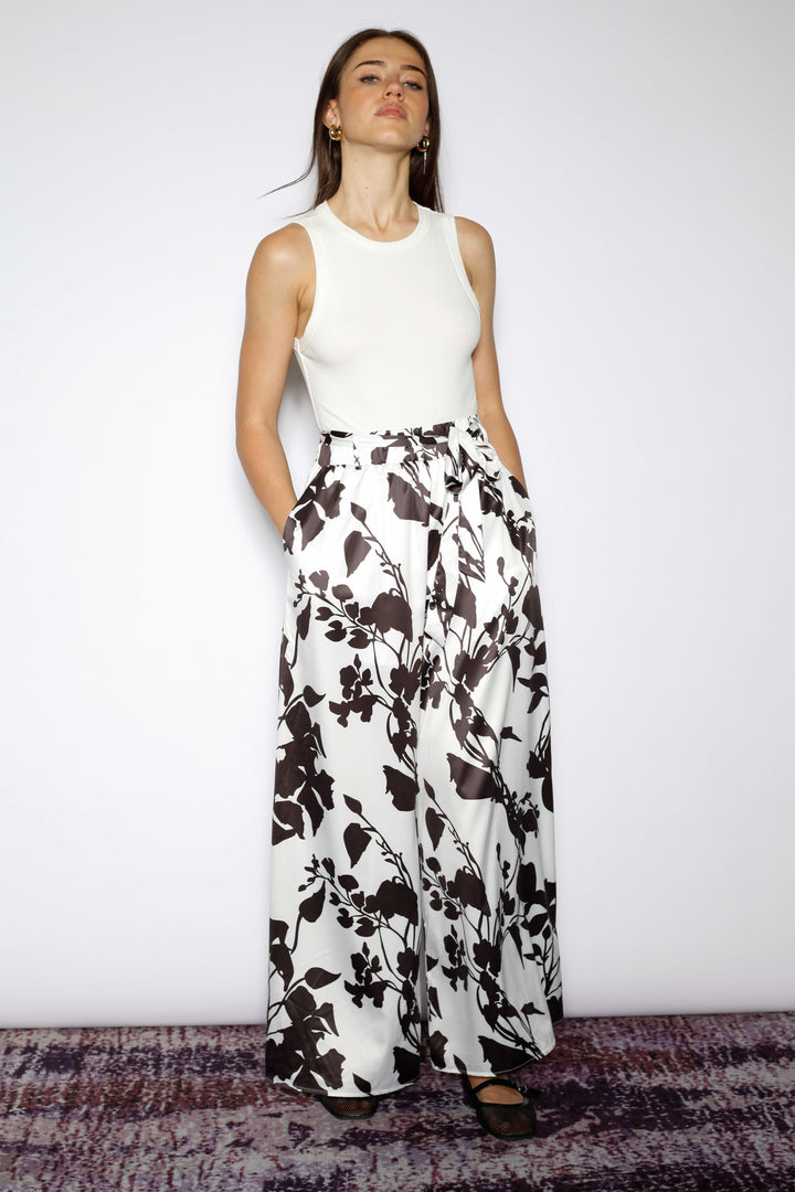 Elegant and breezy, these wide-leg pants are crafted from fluid silk featuring a bold black-on-white floral silhouette print. The high-rise elastic waist with a self-tie belt ensures comfort without sacrificing polish, while the dramatic wide leg creates a flowing, effortless silhouette. Perfect for day-to-evening dressing, styled with everything from camisoles to structured blazers.