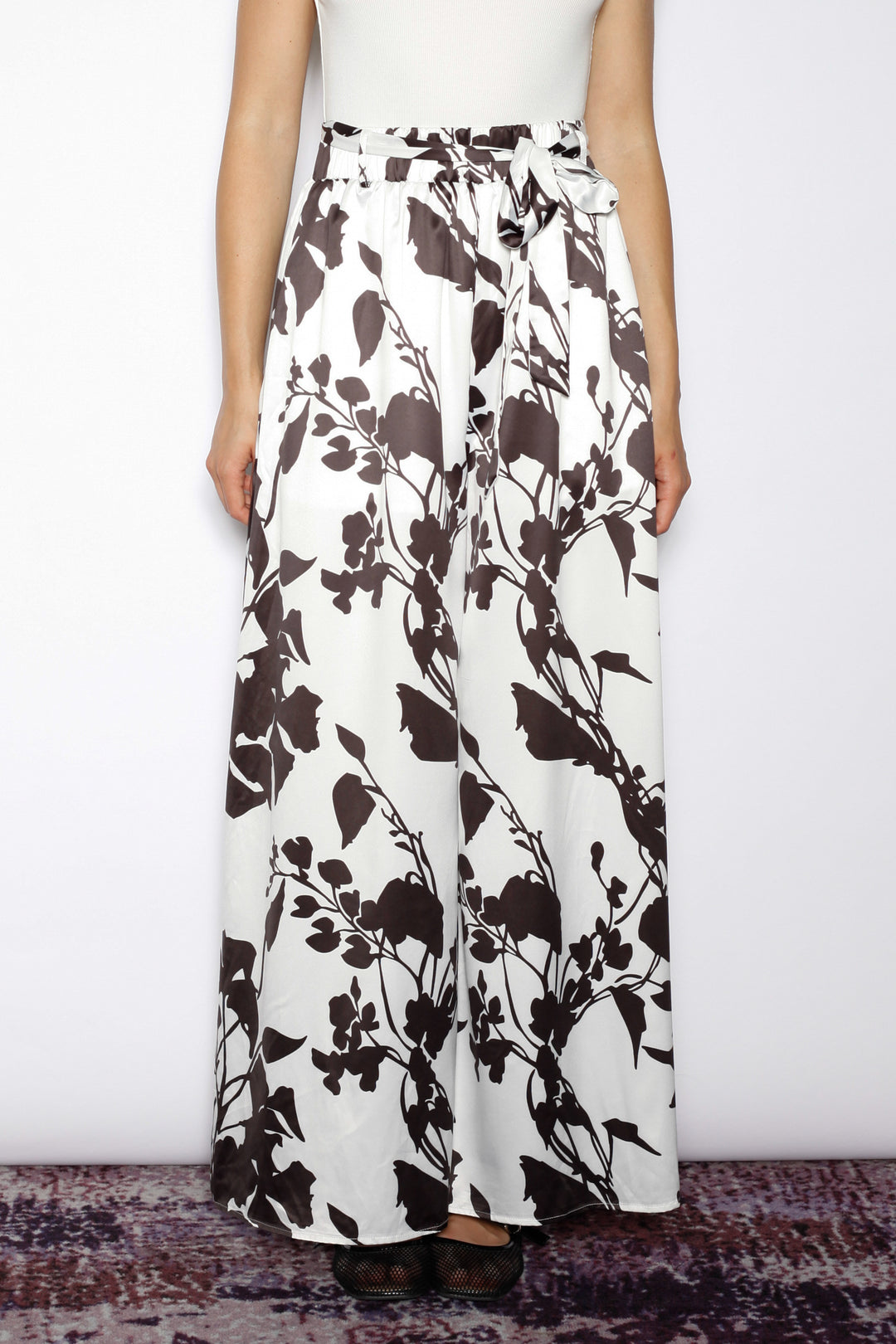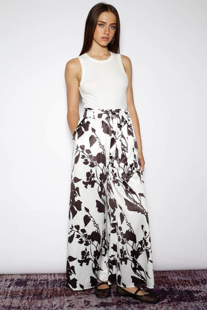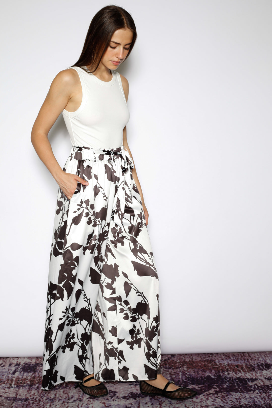 Elegant and breezy, these wide-leg pants are crafted from fluid silk featuring a bold black-on-white floral silhouette print. The high-rise elastic waist with a self-tie belt ensures comfort without sacrificing polish, while the dramatic wide leg creates a flowing, effortless silhouette. Perfect for day-to-evening dressing, styled with everything from camisoles to structured blazers.