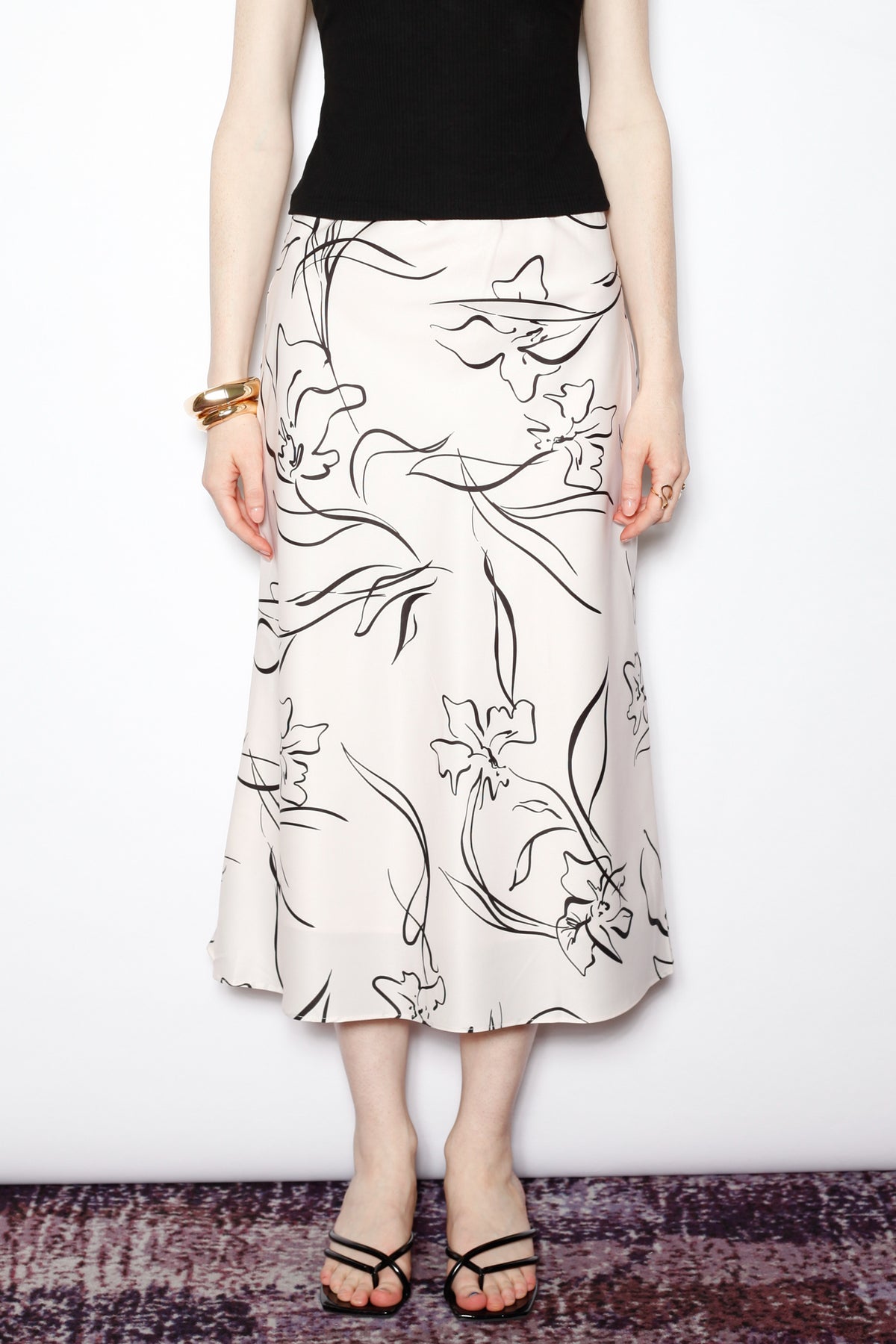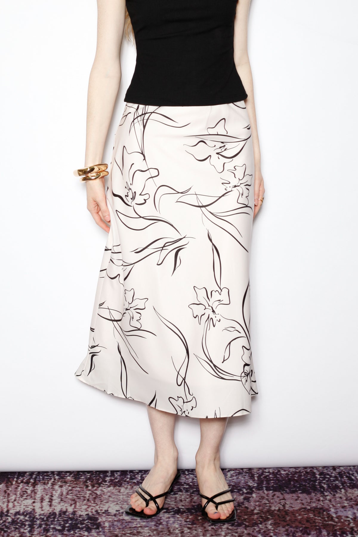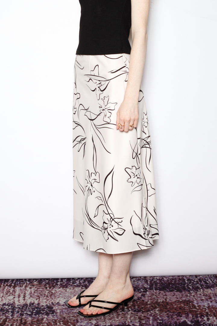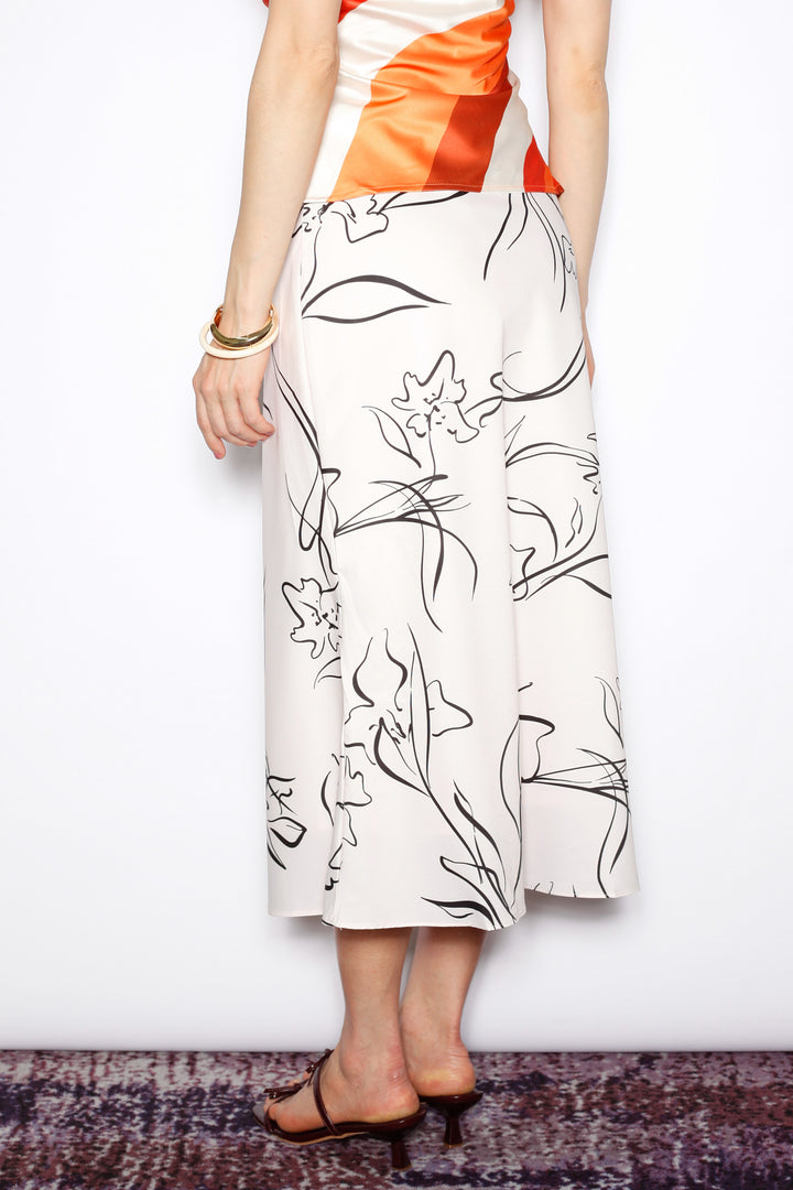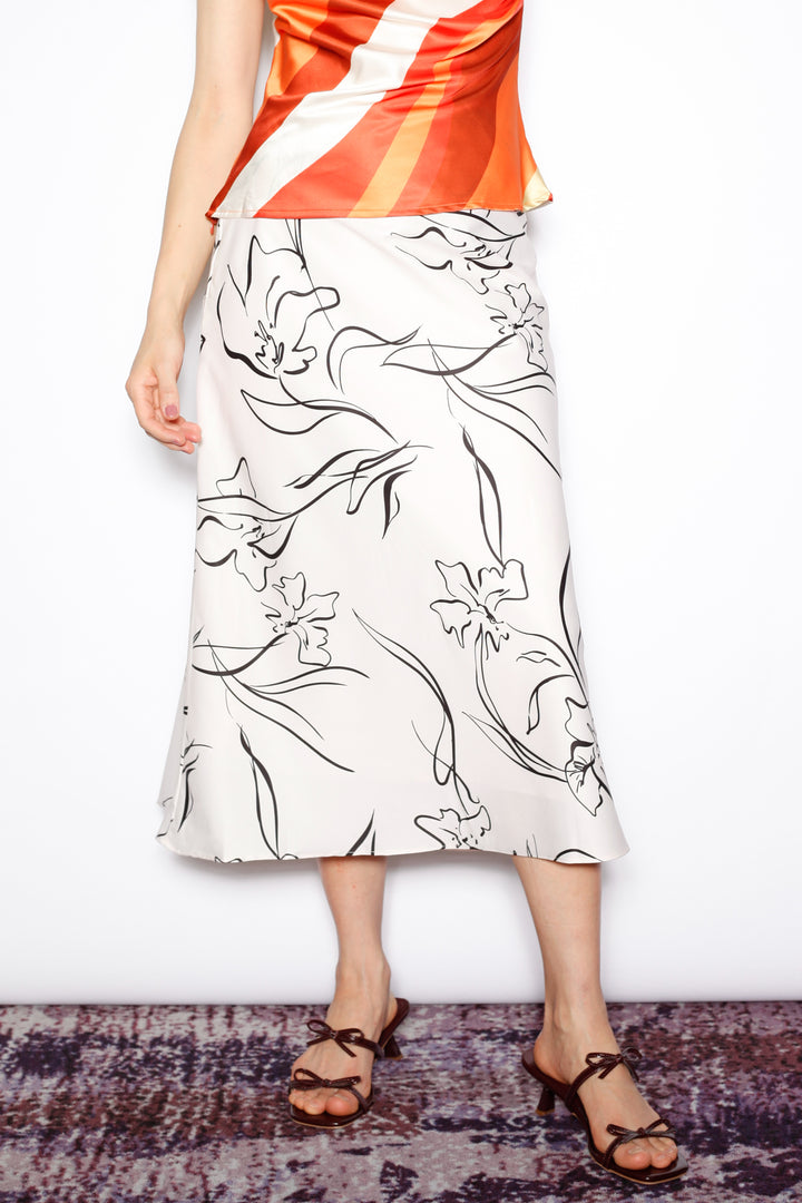 An effortless classic with a modern twist. This beige silk midi skirt features a bold black floral sketch print for a statement look that remains timeless. The bias-cut silhouette creates a graceful drape, offering ease and elegance for everyday wear or a dressed-up evening.