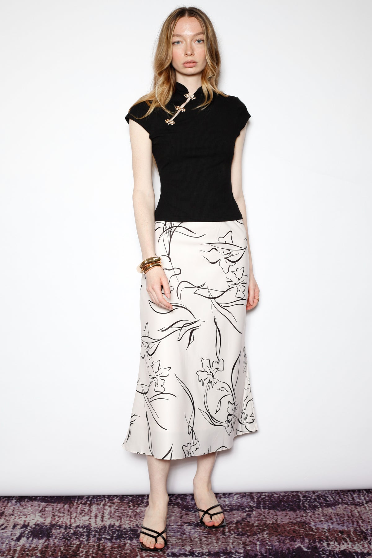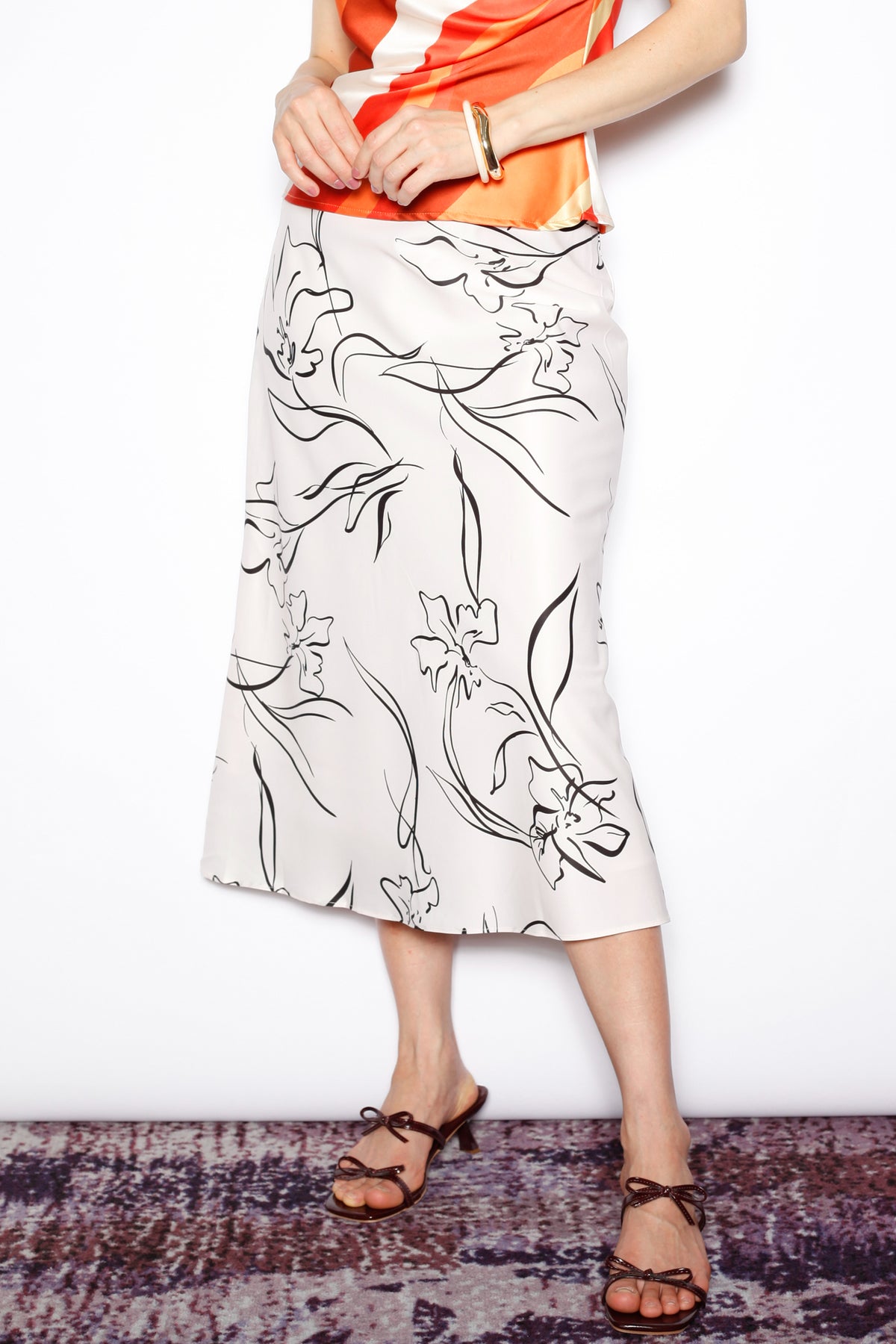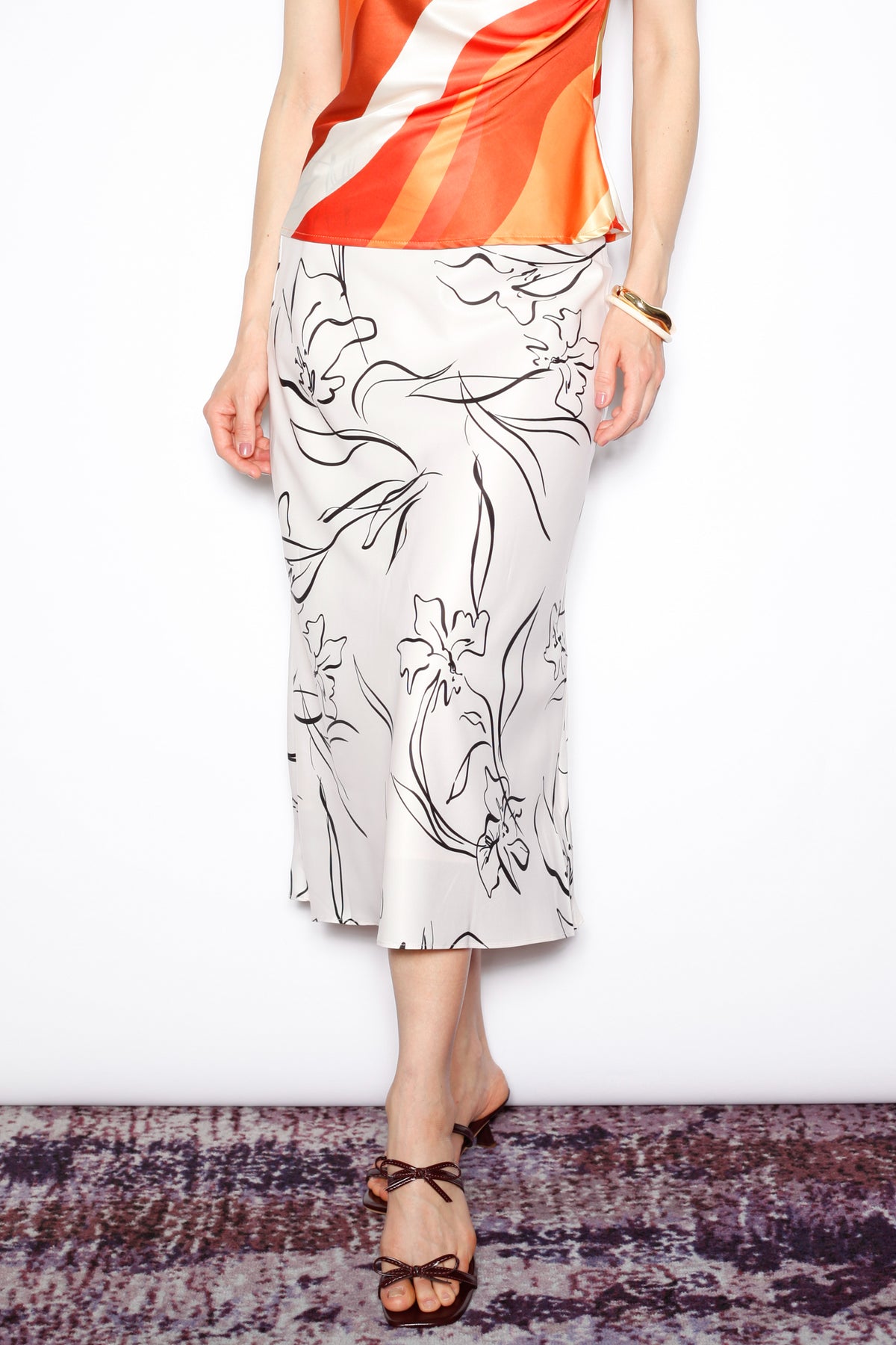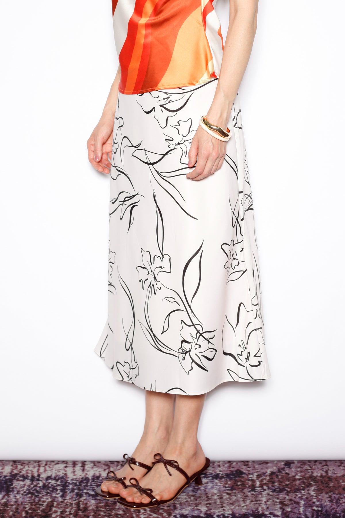 An effortless classic with a modern twist. This beige silk midi skirt features a bold black floral sketch print for a statement look that remains timeless. The bias-cut silhouette creates a graceful drape, offering ease and elegance for everyday wear or a dressed-up evening.