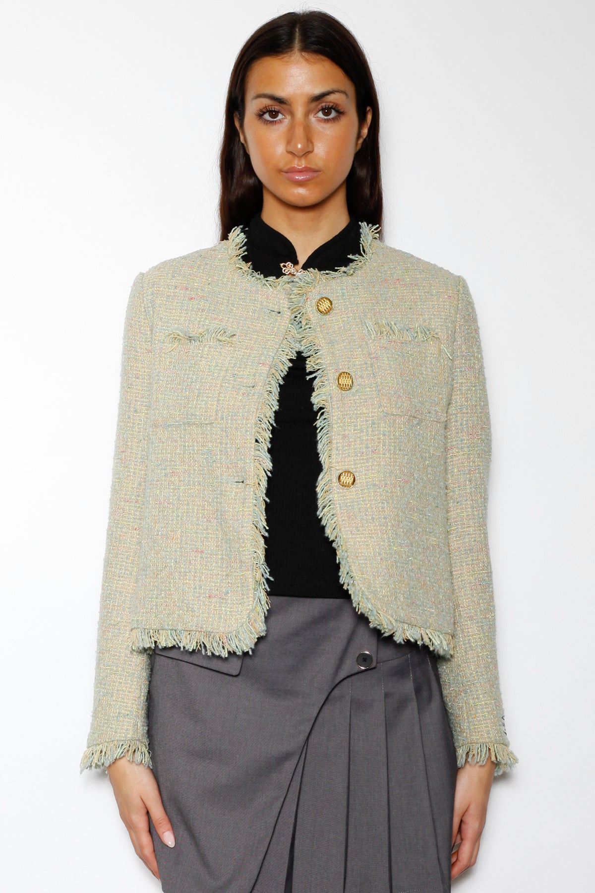 This Wool Green Cropped Tweed Blazer is a refined yet effortless essential. The soft green tweed, accented with subtle pastel flecks, brings a fresh and sophisticated feel. Designed with a cropped silhouette, frayed edges, and two front pockets, it blends timeless tailoring with a modern touch. Perfect for adding structure and charm to any look.