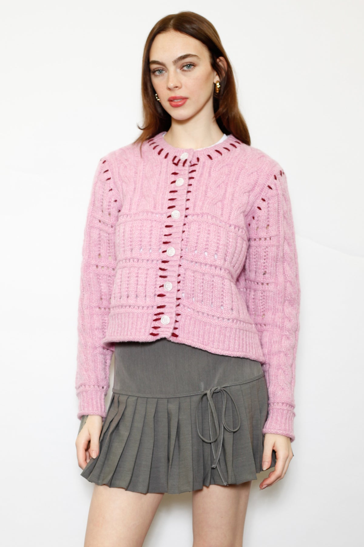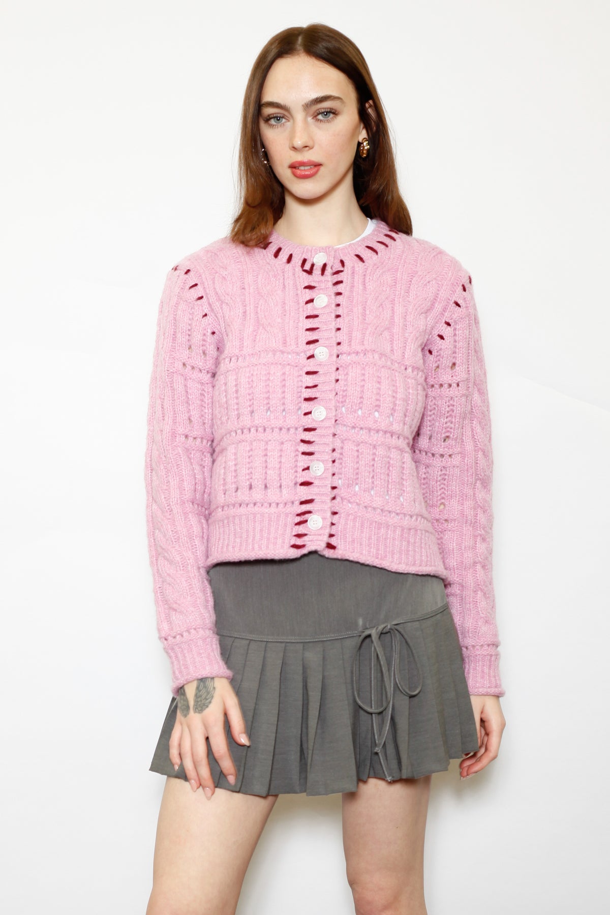 A playful twist on a classic Fair Isle cardigan. This piece features delicate floral jacquard across the yoke, adding softness to its vibrant blue wool base. Ideal for layering with everything from skirts to denim.