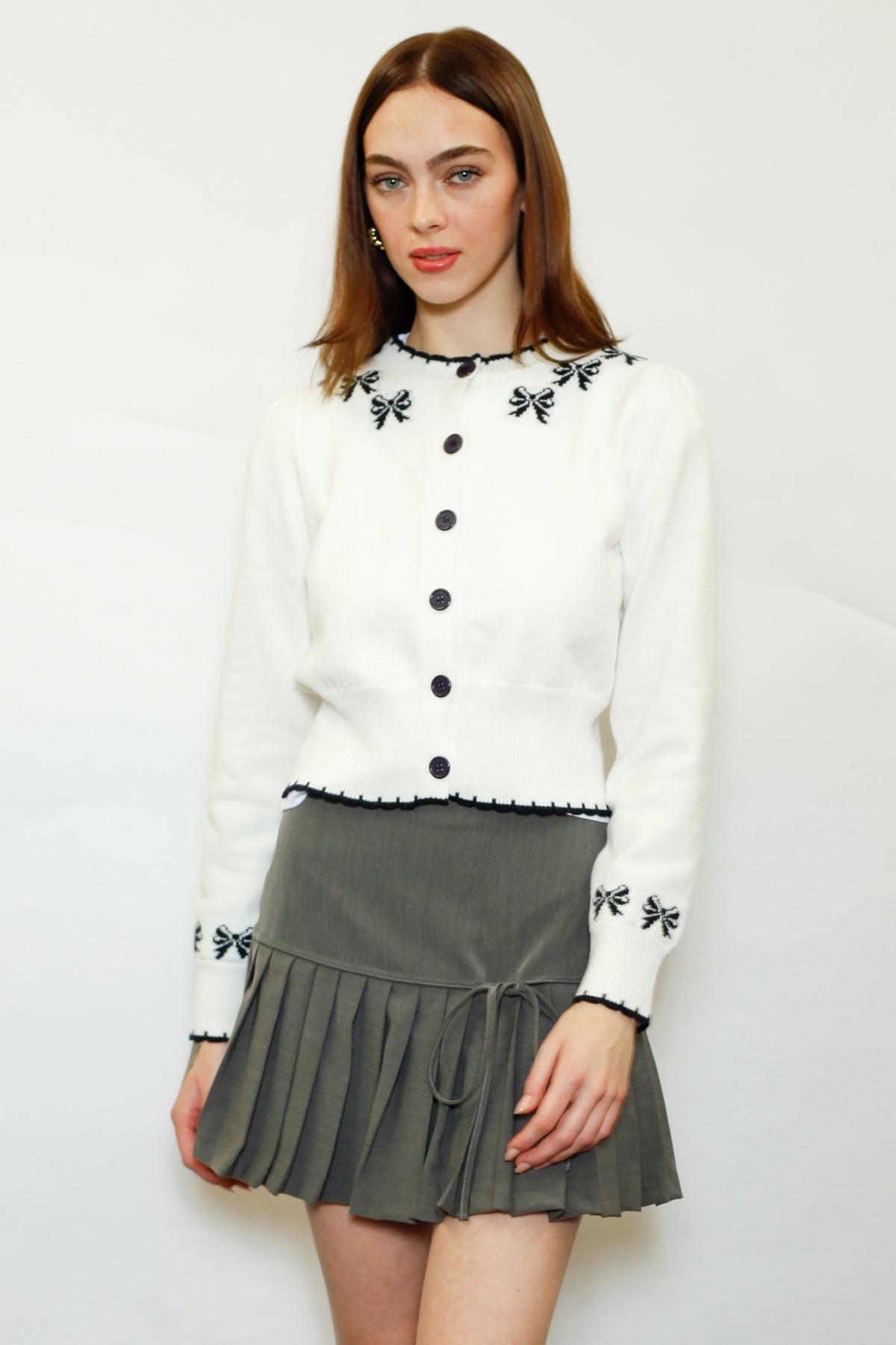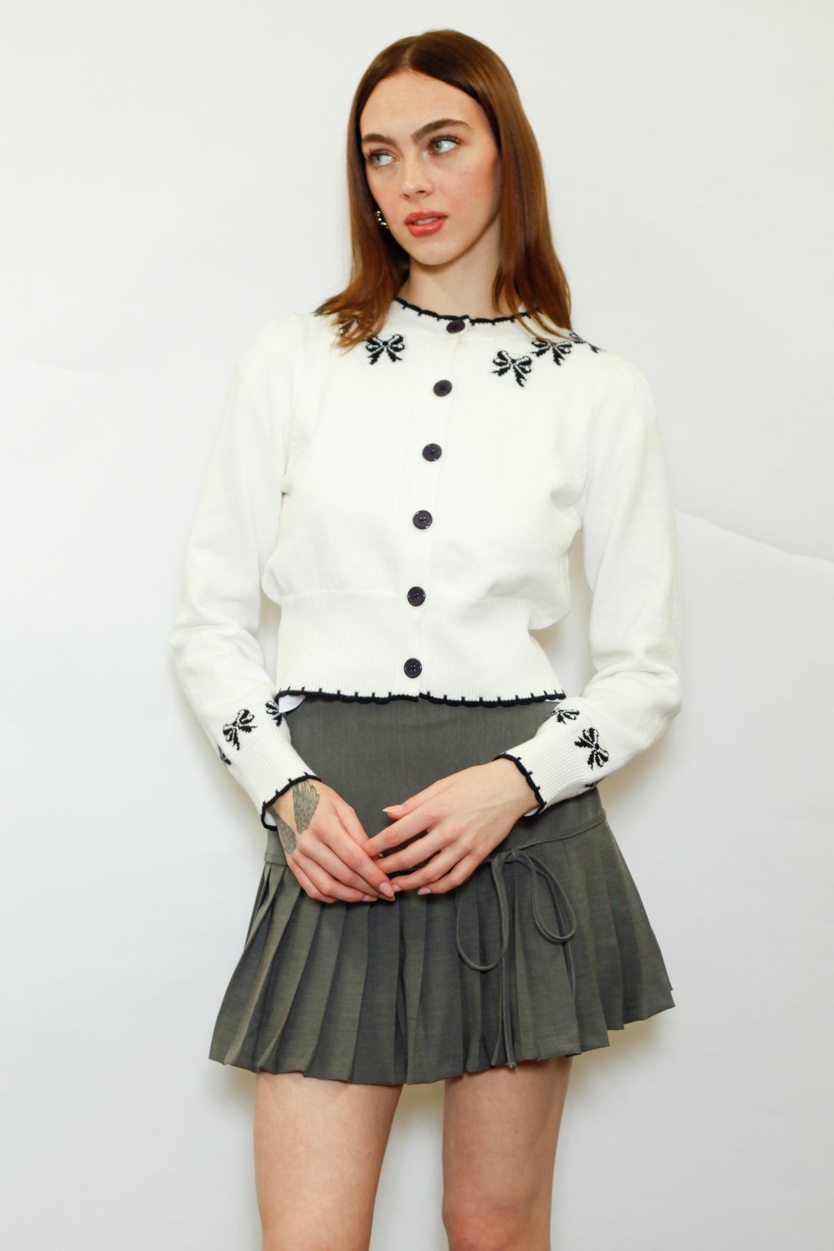 This white cardigan is crafted from pure wool and adorned with black bow jacquard designs along the neckline and cuffs. The cropped silhouette and refined button front make it an effortlessly stylish layering piece. With its subtle stretch and flattering structure, this cardigan is ideal for both everyday elegance and dressed-up occasions.