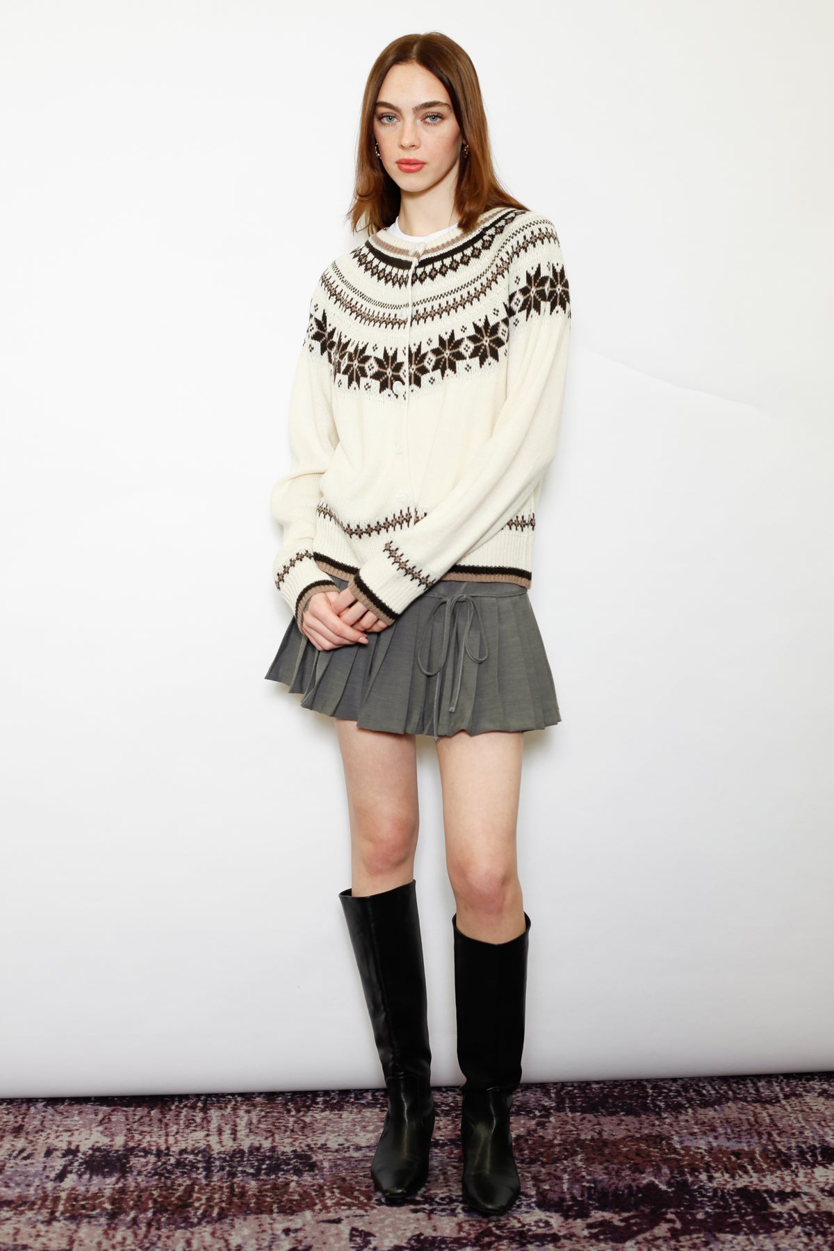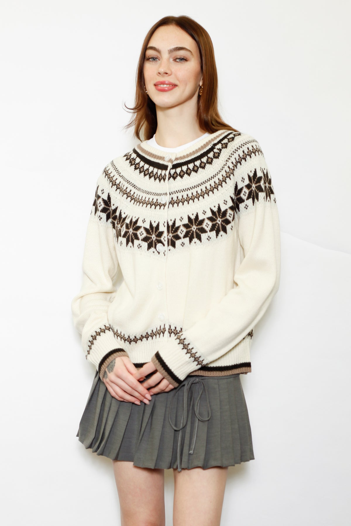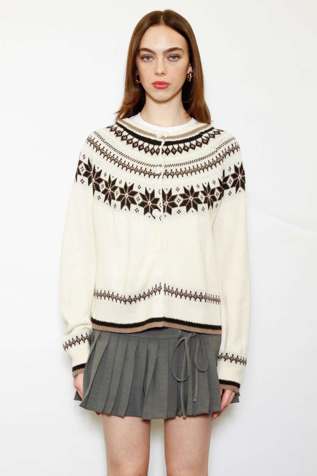 A timeless staple with a Nordic twist, this white cardigan features traditional brown Fair Isle patterns. Its soft, wool-rich composition and classic round neckline make it a perfect layering piece for seasonal transitions.