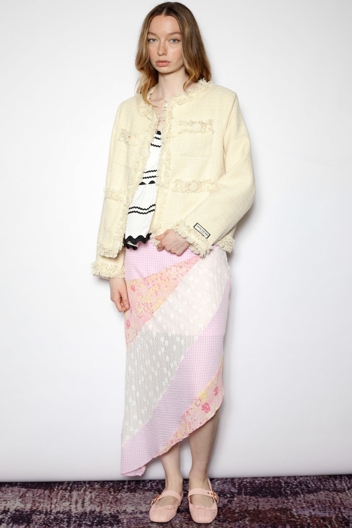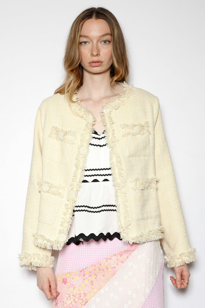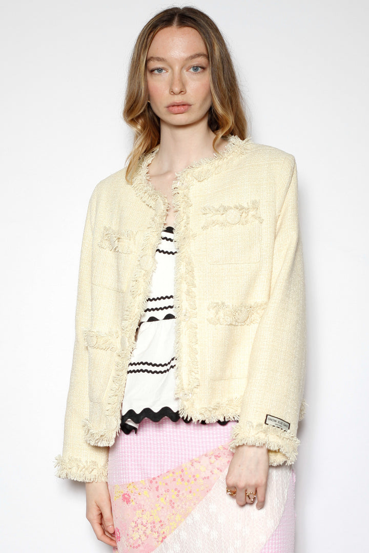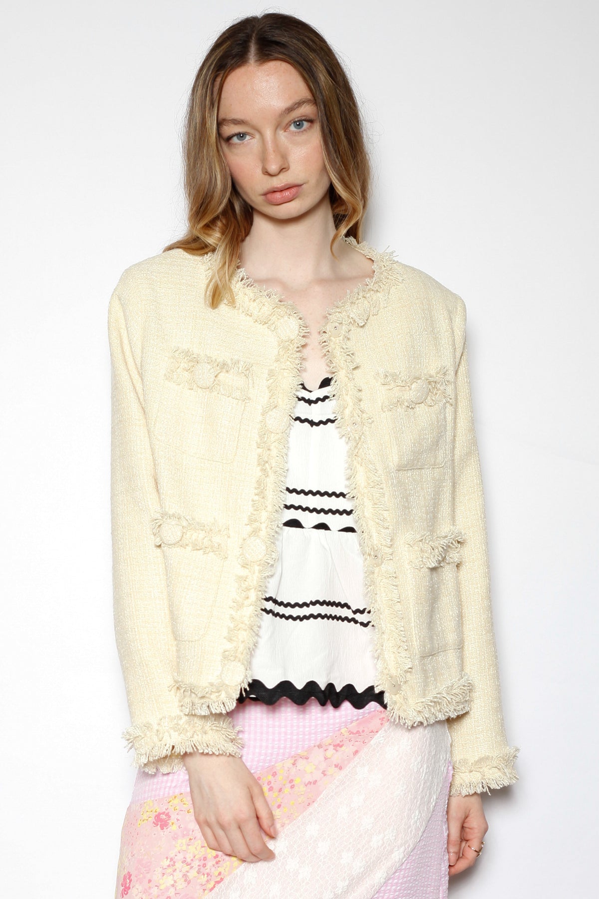 This luxurious and bold Wool Yellow Tweed Blazer is a stunning addition to any wardrobe. Crafted with high-quality wool, this blazer features a striking yellow plaid tweed pattern that exudes confidence. Perfect for making a statement and adding a touch of formality to any outfit. A defining piece that is crafted in a soft yellow tweed. This enchanting blazer features frayed edges, adding a stylish and modern twist to the classic cropped design.